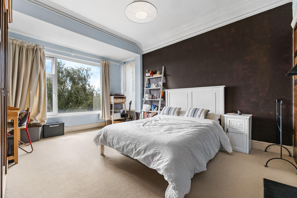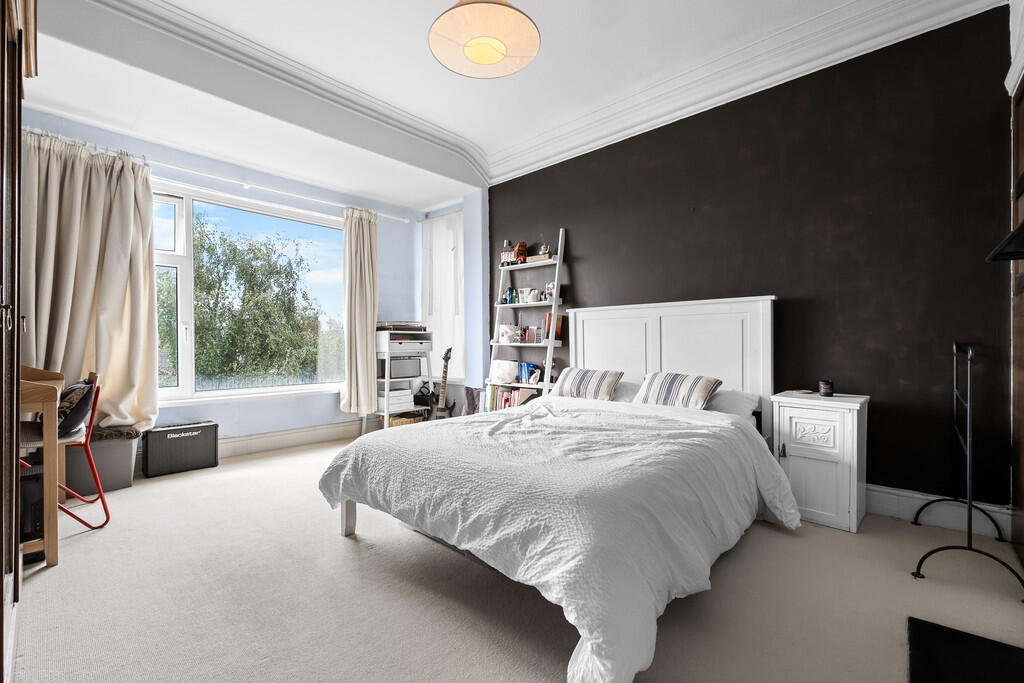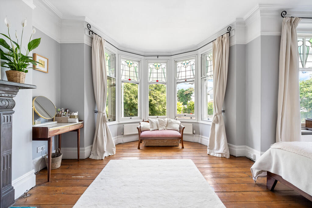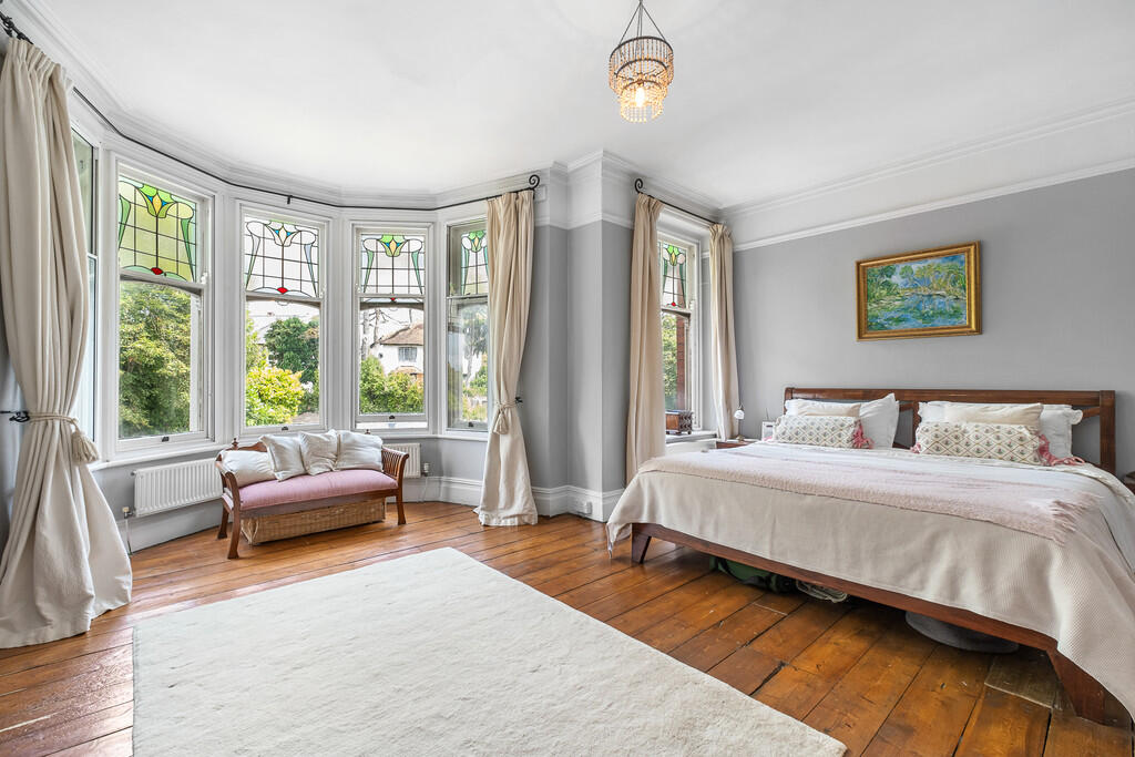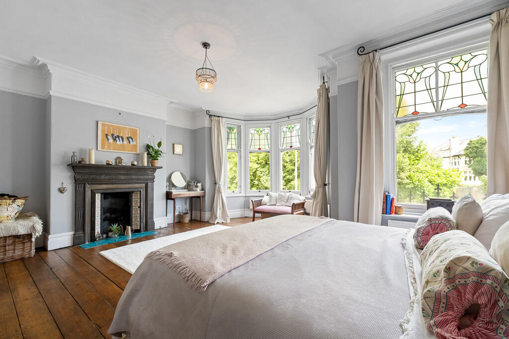 BEDROOMONE17' 11" x 15' 2" (5.48m x 4.64m) Sash bay windows to front aspect and additional window with feature stained glass above. Large double bedroom. Exposed floorboards. Original cast iron feature fireplace with tiled base. Alcoves. Coving. Picture rail. Pendant light fitting. Radiator. Power points.