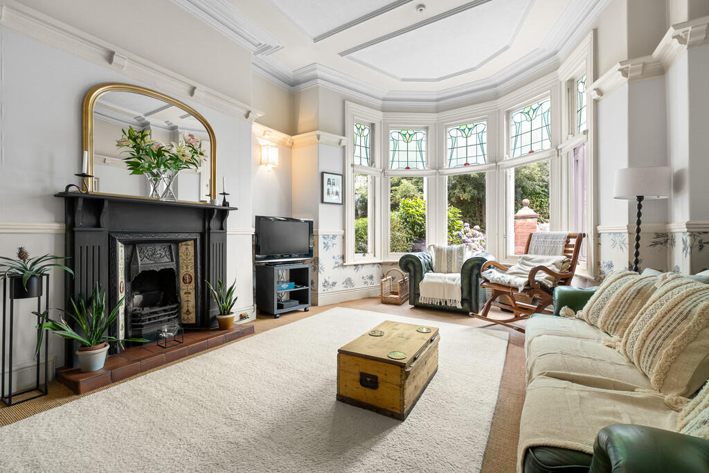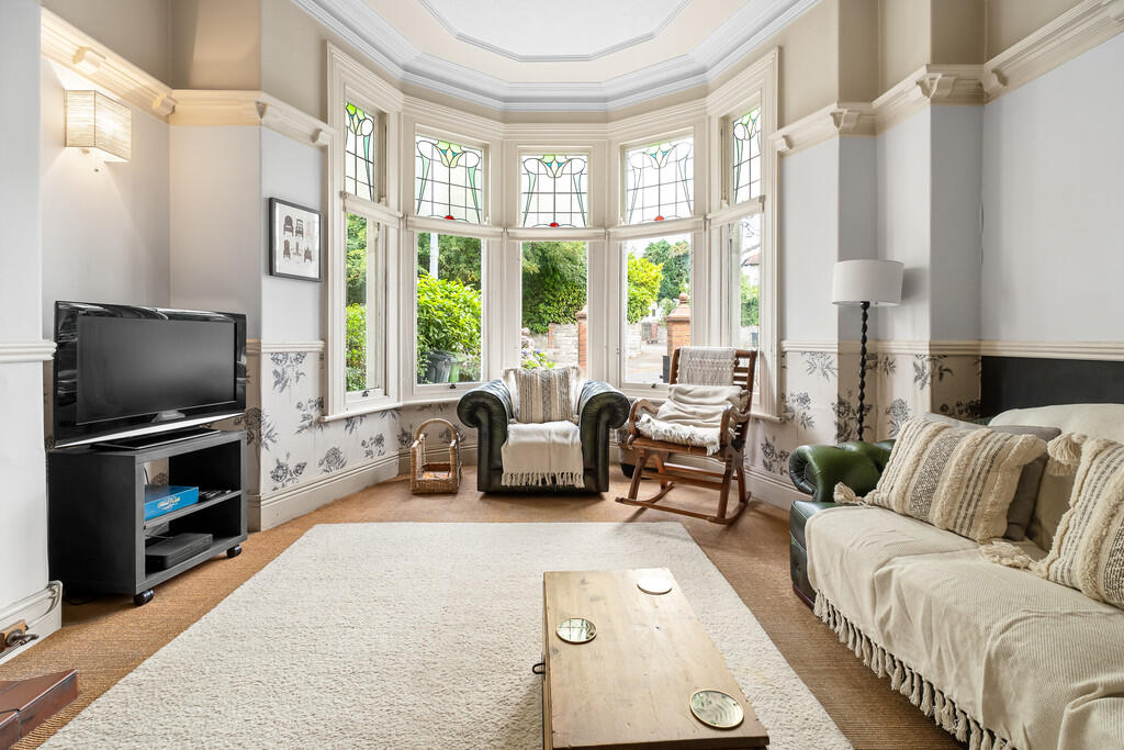 LOUNGE14' 10" x 13' 3" (4.53m x 4.06m) Sash bay windows to front aspect with feature stained glass above. Carpeted flooring. Original cast iron fireplace with inset gas fire and tiled base. Dado rail and picture rail. Original coving. Pendant light fitting with ceiling rose. Radiator. Alcoves. Power points.