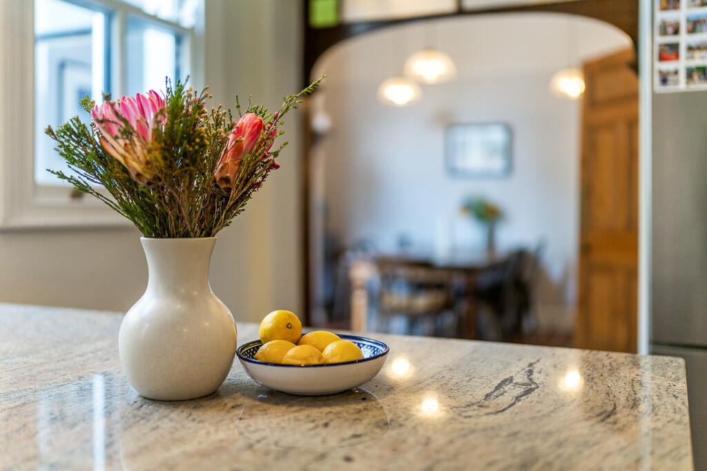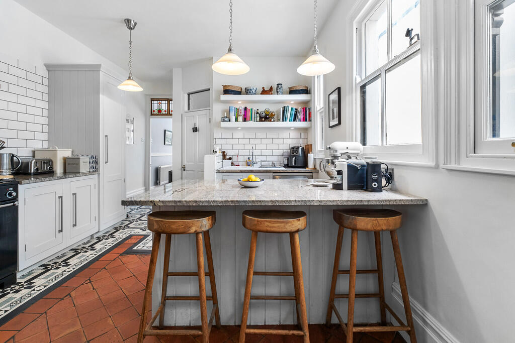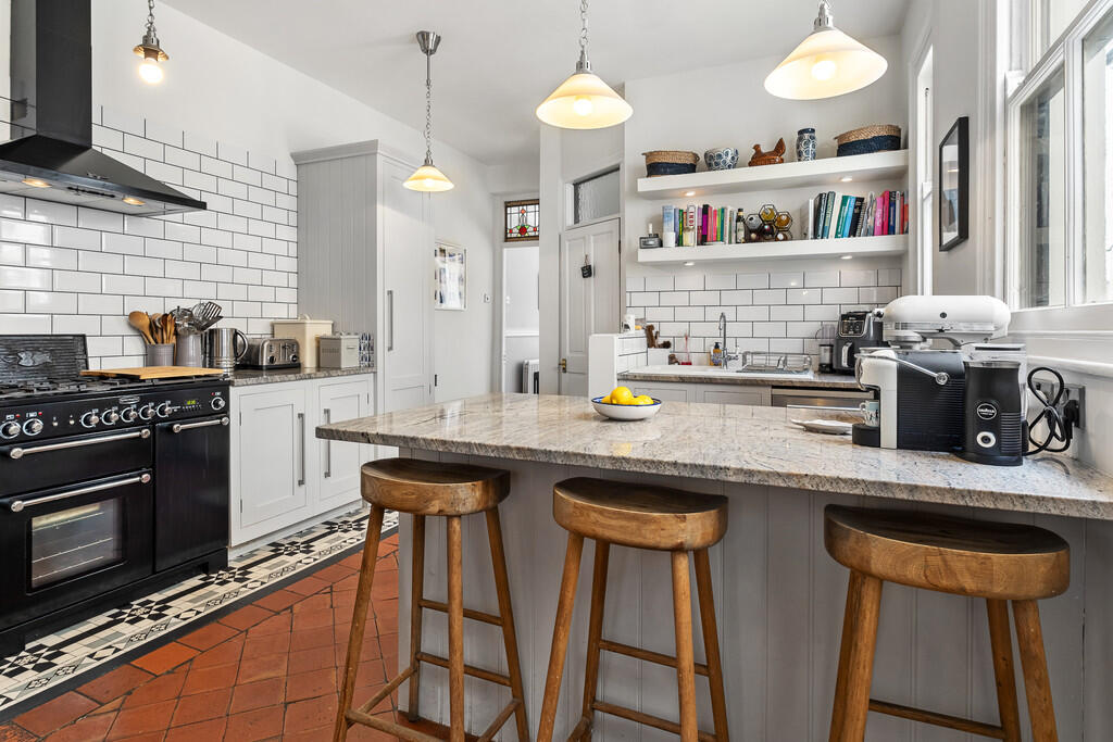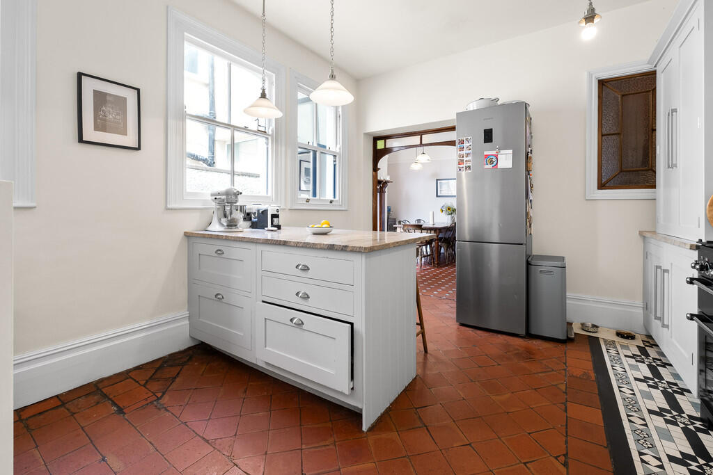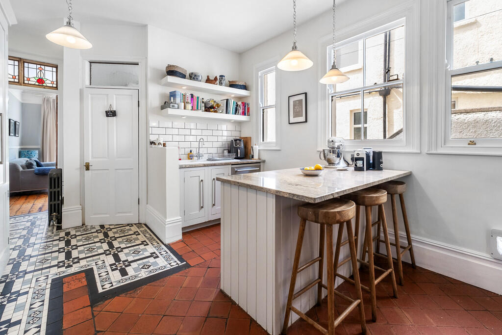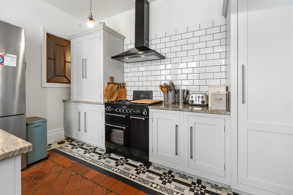 KITCHEN20' 5" x 12' 1" (6.24m x 3.69m) Modern fitted Harvey Jones kitchen with a range of wall, base and drawer units with marble quartz worktops over incorporating inset 1.5 sink and drainer with mixer tap over. Rangemaster cooker with five ring gas hob and extractor hood over. Tiled splashbacks. Space for large fridge/freezer and dishwasher. Central island with worktops over and ample storage beneath with additional space for stool seating. Hanging pendant light fittings. Sash windows to side aspect and additional obscure window through to hallway. Original tiled flooring. Power points. Radiator. Doors to WC and sitting room.