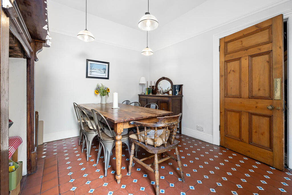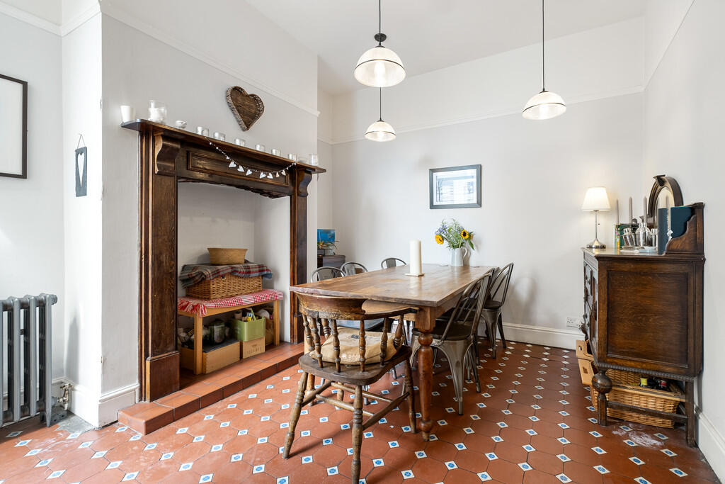 DININGROOM12' 0" x 11' 5" (3.67m x 3.50m) Continuation of original tiled flooring. Space for dining. Double doors leading to rear garden. Original feature fireplace with tiled base. Hanging pendant light fittings. Picture rail. Alcoves. Radiator.