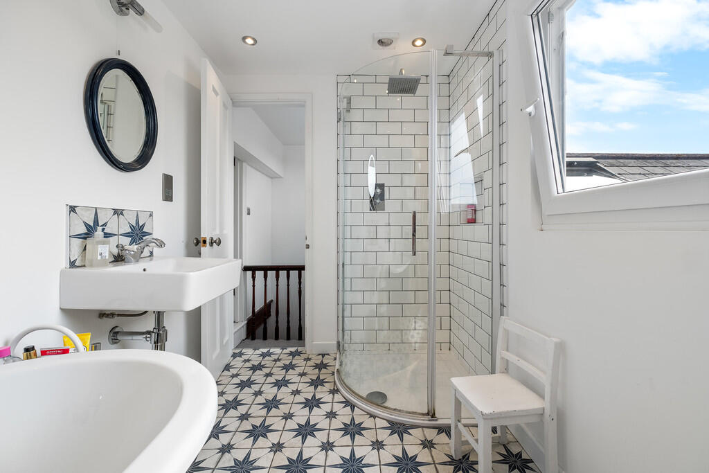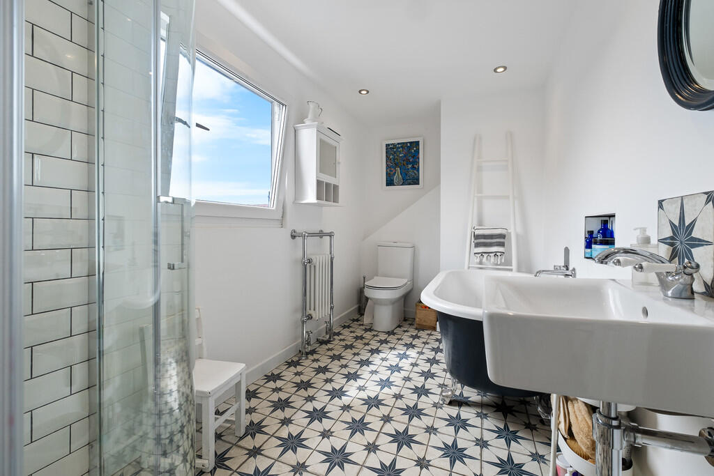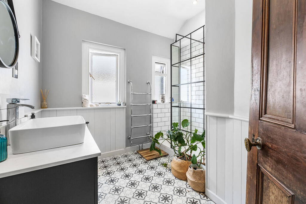 BATHROOM11' 11" x 5' 9" (3.65m x 1.77m) Modern bathroom with double glazed uPVC window to rear aspect. White suite comprising freestanding bath with mixer tap over, wall mounted wash hand basin with mixer tap over and tiled splashback. Separate corner shower cubicle with mains shower over and tiled splashbacks. WC. Tiled flooring. Extractor. Shaver point. Spotlights. Radiator with heated towel rail.