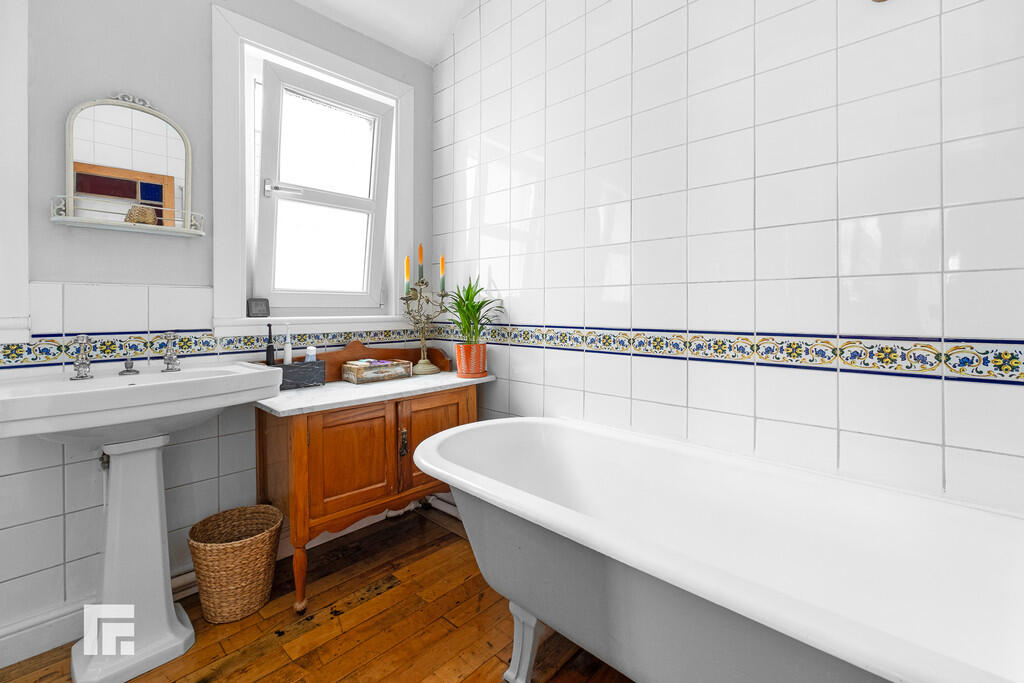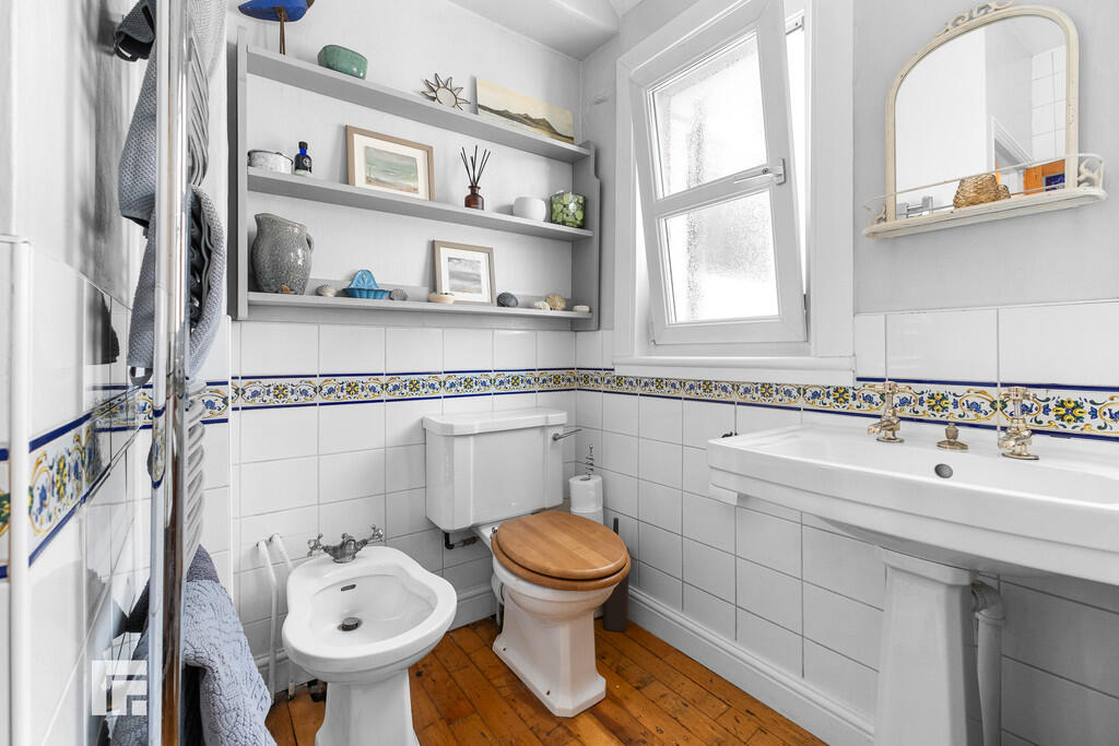 BATHROOM7' 8" x 8' 2" (2.34m x 2.50m) Original floorboards. WC. Pedestal wash hand basin with hot and cold tap over. Bath with hot and cold tap over and mains powered shower above. Bidet. Two obscure double glazed windows to side aspect. Fixed shelving. Spotlights.