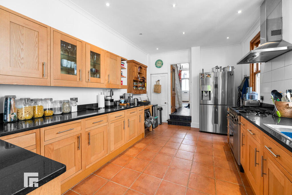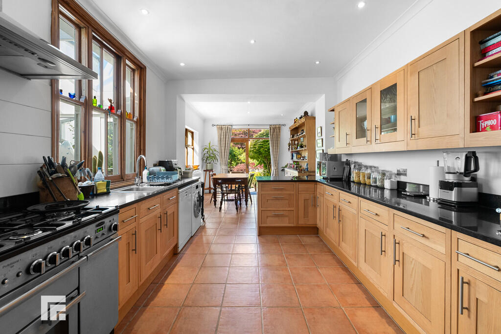 KITCHEN11' 2" x 15' 11" (3.41m x 4.87m) Tiled flooring throughout. Spotlights to ceiling. Fitted kitchen with a range of wall, base and drawer units with stone worktops over incorporating stainless steel sink and drainer with hot and cold tap over. Range cooker with five ring gas hob and extractor hood over. Plumbing for washing machine, dishwasher and space for fridge/freezer. Wooden frame windows to one side aspect. Radiator. Door to :-