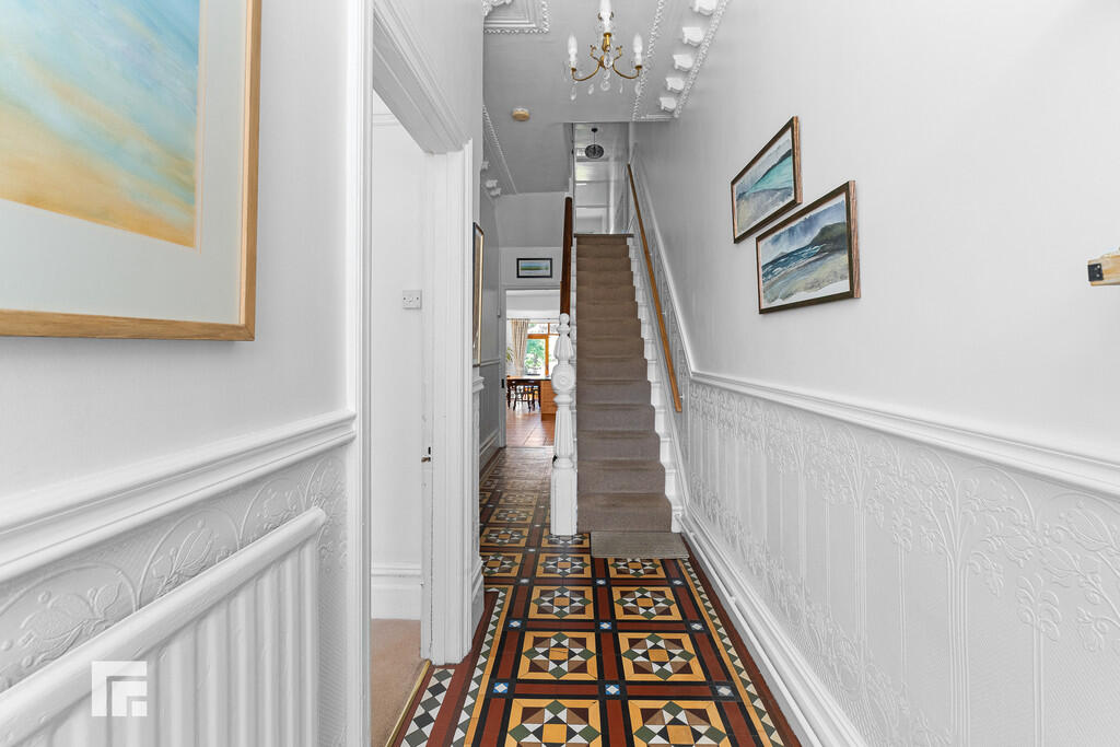 ENTRANCEHALL Original tiled flooring. Original coving to ceiling. Pendant light fitting with ceiling rose. Radiator. Dado rail. Doors to both reception rooms, basement and kitchen/breakfast room. Stairs rising to first floor.