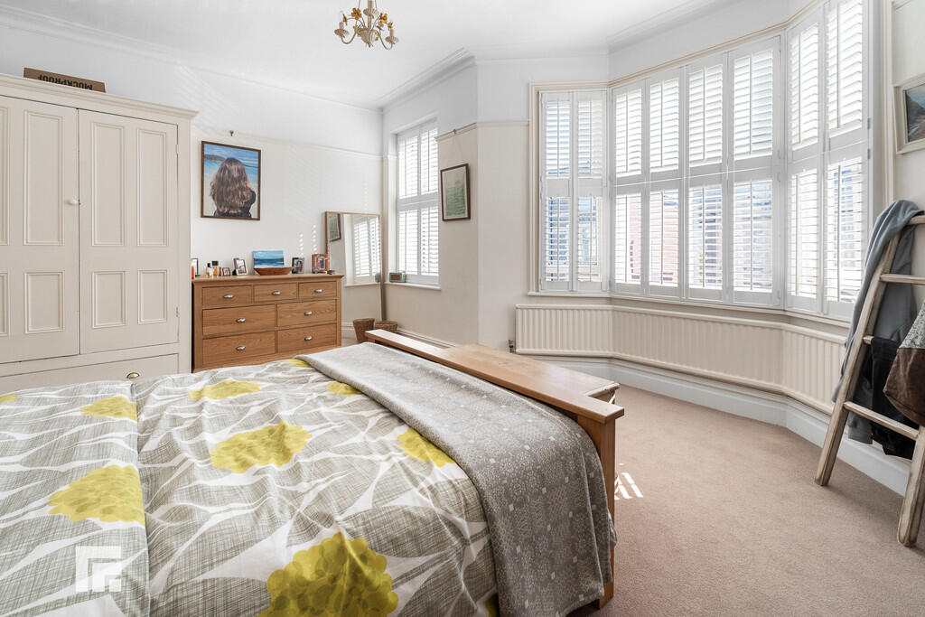 BEDROOMONE17' 10" x 13' 6" (5.45m x 4.13m) Carpet to floor. Bay windows to front aspect with additional window alongside - both fitted with shutter blinds.. Coving to ceiling. Pendant light fitting with ceiling rose. Feature fireplace with alcoves either side. Fitted wardrobes. Picture rail. Radiator.