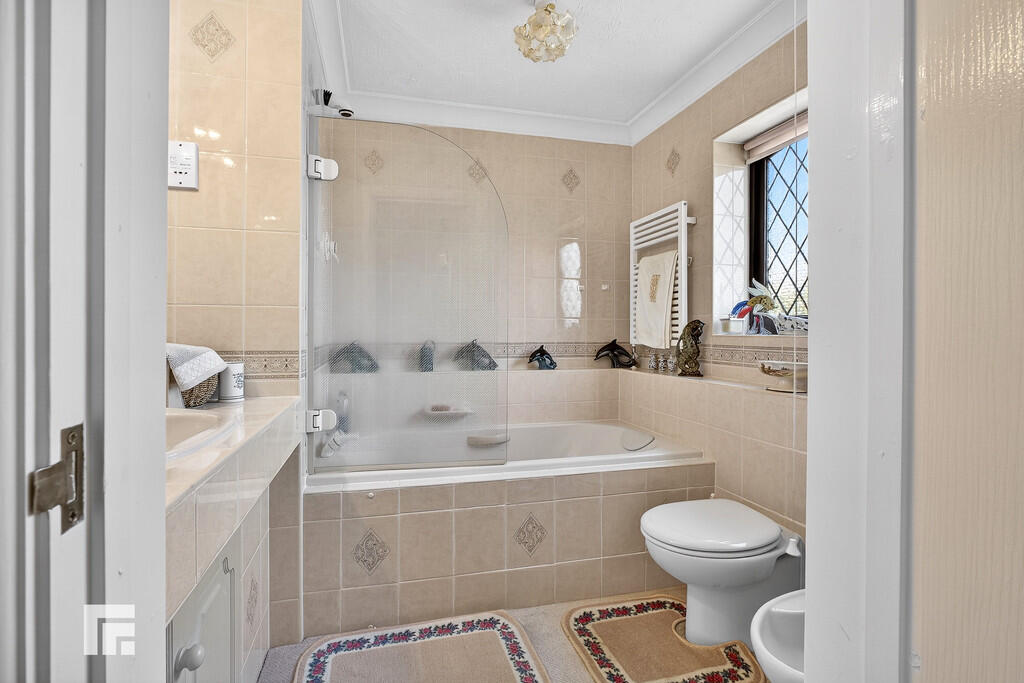 EN-SUITEONE8' 5" x 8' 0" (2.57m x 2.44m) Off white suite; low level WC, bidet, wash hand basin with white miser tap and tiled vanity unit, bath with tiled panel, white mixer tap and white shower. Two heated towel rails. Shaving point. Extractor fan. Window to front.