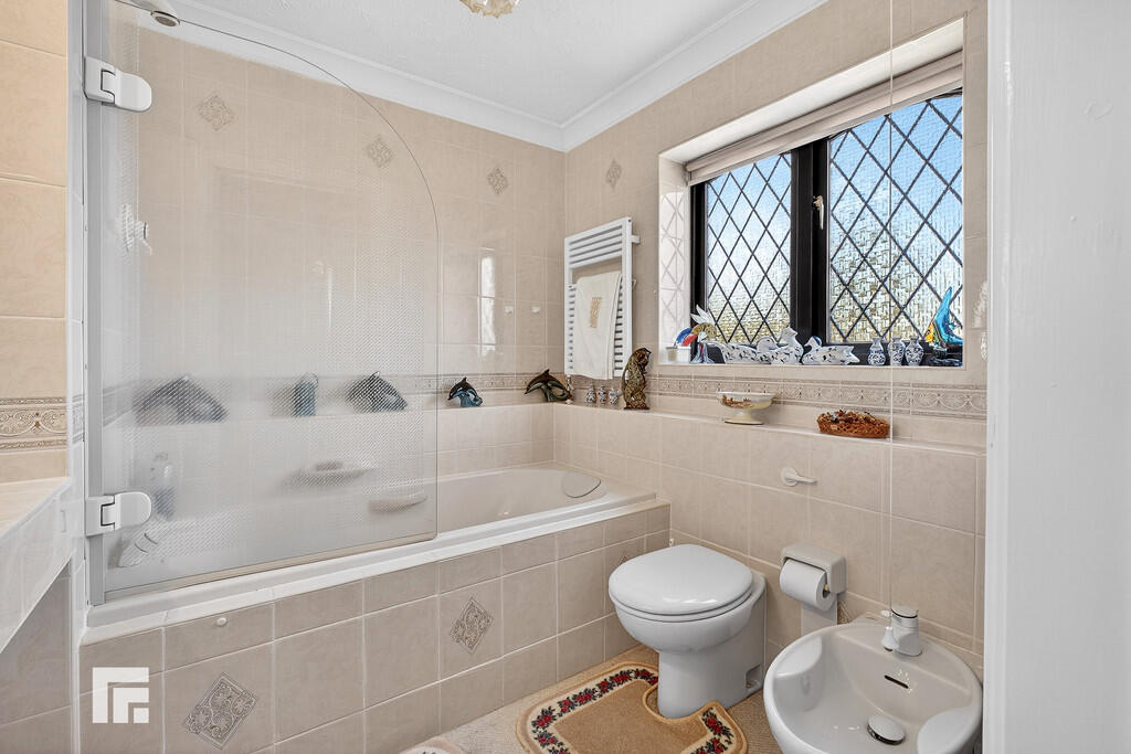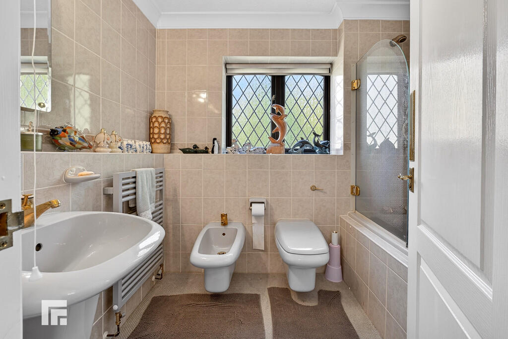 FAMILYBATHROOM8' 8" x 6' 0" (2.65m x 1.84m) Neutral suite; low level WC, wall hung wash hand basin with gold mixer tap, bath with gold mixer tap, gold shower and glass shower screen. Bidet. Heated towel rail. shaving point. Extractor fan. Tiled walls. Obscured glass window to side.