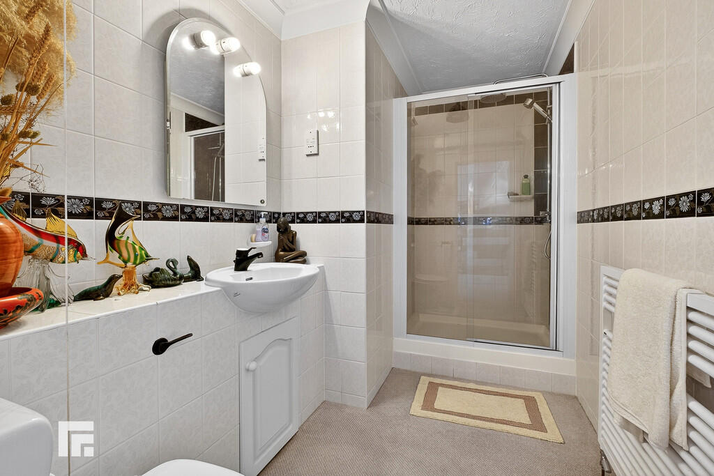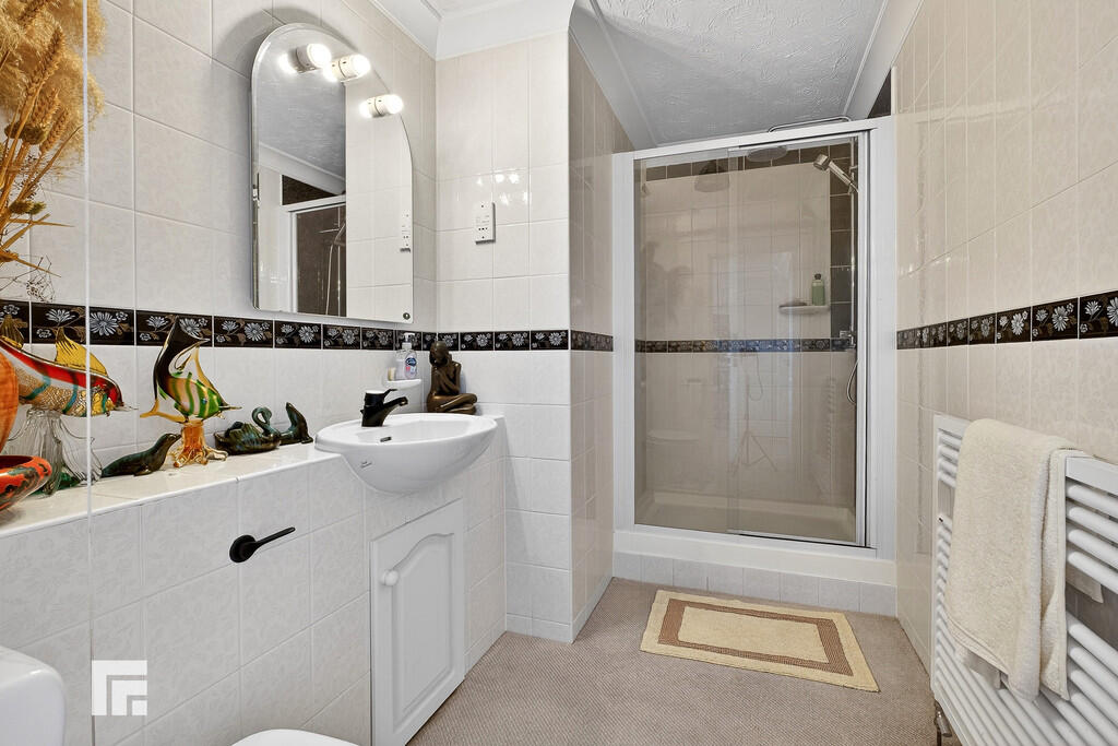 EN-SUITETWO9' 9" x 5' 9" (2.99m x 1.76m) White suite; low level WC, built in wash hand basin with black miser tap and vanity, shower with dual headed chrome shower and glass window sliding shower screen. Heated towel rail. Extractor. Tiled walls.