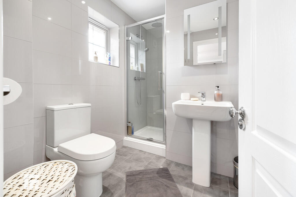 ENSUITE5' 1" x 5' 7" (1.557 m x 1.722 m) uPVC window to front aspect with obscure glass. Spotlights. Tiled walls. Ladder style radiator. Wash hand basin. WC with inset flush. Extractor fan.