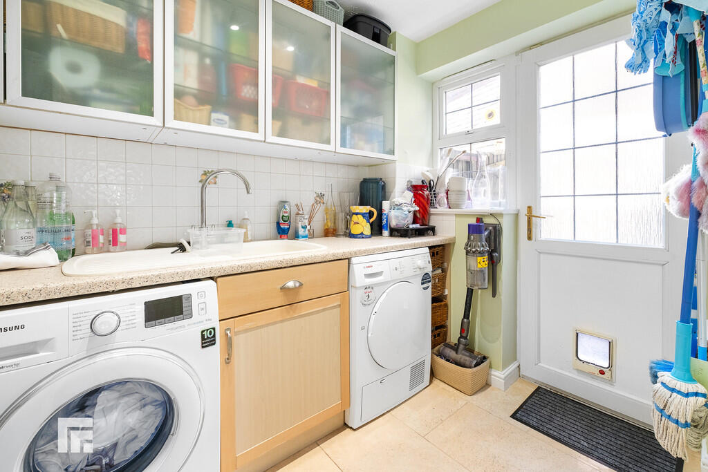 UTILITYROOM8' 11" x 8' 8" (2.731 m x 2.653 m) uPVC door with obscure glass to side access. uPVC window to side aspect. Base cabinets with space for white goods and countertop above. Wall mounted cabinets. Tiled splash back.