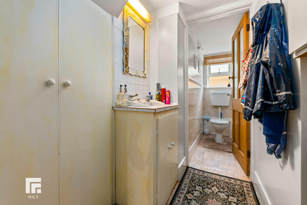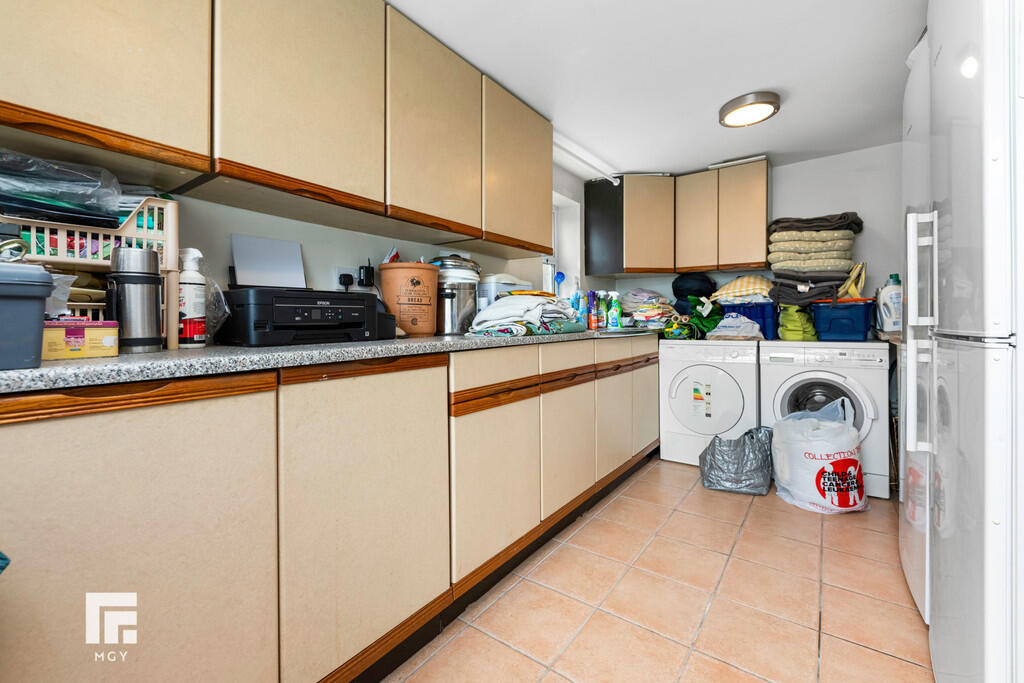 UTILITYROOM15' 1" x 7' 11" (4.60m x 2.42m) Double glazed uPVC window to front. Obscured double glazed uPVC window to side. Tiled floor. Radiator. Base and wall units with stainless steel sink unit and with hot and cold taps. Plumbing and space for washing machine and tumble dryer. Space for fridge / freezer.