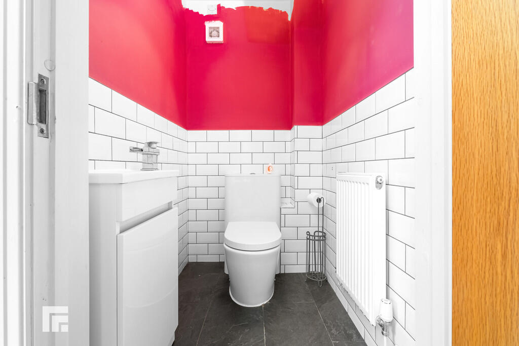 WC Tiled floor. Part tiled walls. W.c, vanity enclosed wash hand basin with mixer tap.