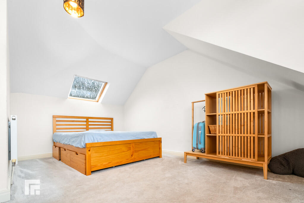 MASTERBEDROOM15' 4" x 12' 3" (4.69m x 3.74m) Large double glazed uPVC window to rear. Velux skylight. Generous eaves storage cupboard. Radiator. Door to:-