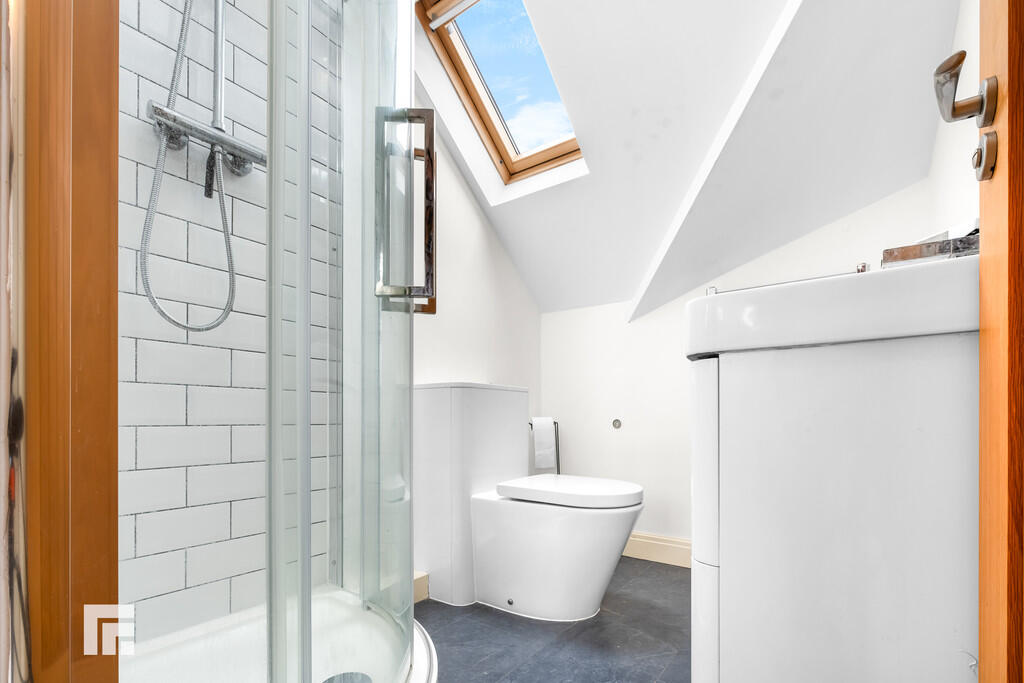 ENSUITE6' 10" x 5' 2" (2.09m x 1.58m) Velux skylight. Tiled flooring. Tiled shower cubicle with mains shower, w.c, vanity enclosed wash hand basin with mixer tap and storage below. Chrome heated towel rail.