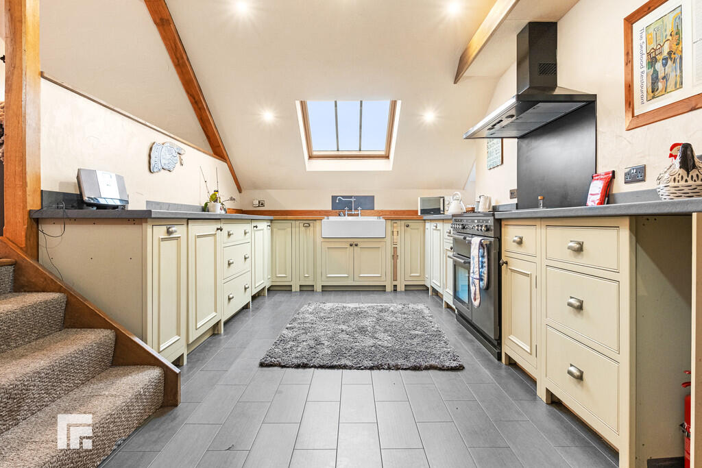 KITCHEN Entered via wooden door with glazed panels onto first floor level. Radiator. Door to hallway, steps leading down to lower ground floor, plus steps up to lounge area. A modern fitted kitchen with a range of base units incorporating double Belfast under counter sink unit and complementary work surfaces. Integrated fridge, freezer and dishwasher. Fitted gas range cooker with extractor hood over. Velux window to rear, plus feature uPVC double glazed window to side with fantastic views.