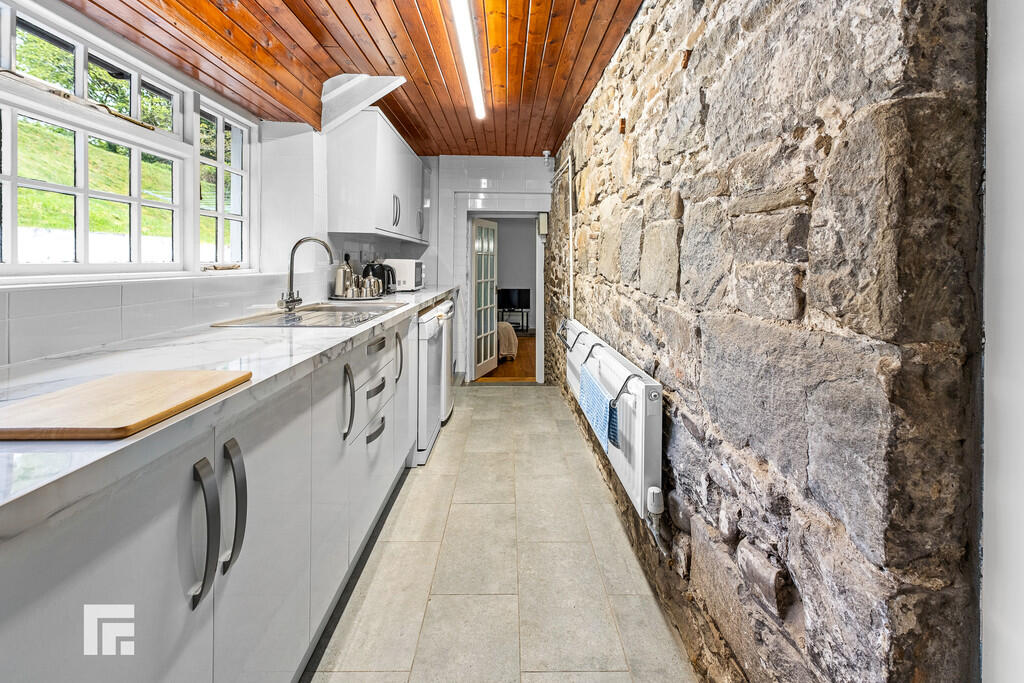 KITCHEN17' 3" x 5' 4" (5.27m x 1.63m) Appointed along one side in high gloss fronts beneath marble effect laminate worktop surfaces. Inset stainless steel sink with side drainer. Plumbing for dish washer. Space for fridge. Space for slot in cooker. Matching range of eye level wall cupboards. Tiled splash back. Tiled flooring. Doors to lounge and sitting room. Exposed stone wall to one side. Radiator. Archway to the continuation of the kitchen.