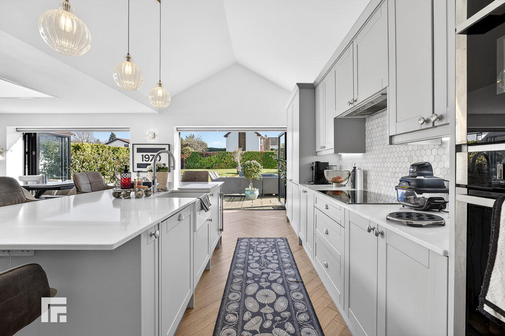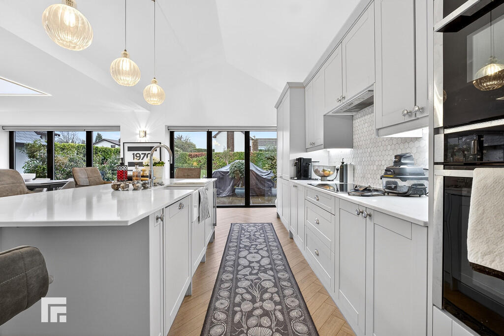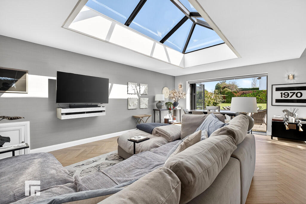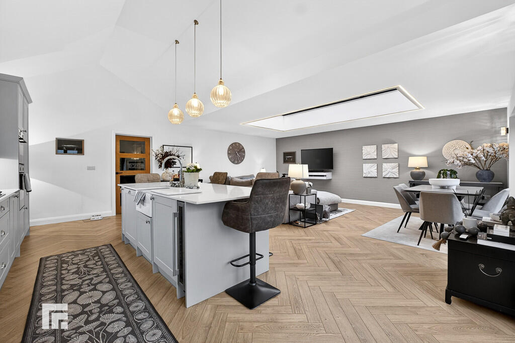KITCHEN/DINING/LIVING21' 2" x 25' 7" (6.468m x 7.799m) A superb bright and spacious open plan area with two sets of bi fold doors leading out to the east facing private rear garden and patio. The kitchen area is fitted with modern shaker style wall and base units with Quartz work surfaces to kitchen and island unit. Built in Neff fan assisted oven with built in microwave above. AEG five ring induction hob with concealed extractor hood above. Integrated Zanussi full length fridge and integrated full length freezer. Neff integrated dish washer. Central Island with seating for up to six people with 'Butler' style sink and Quooker 100 degree boiling water tap above. Built in wine cooler to the island plus storage cupboards. Three ceiling lights above the Island to remain. Luxury vinyl tile flooring throughout this area, herringbone style, with underfloor heating. Ample space for dining and living with feature glazed lantern rooflight with remote controlled lighting providing an abundance of natural daylight to this area. TV point and power points.