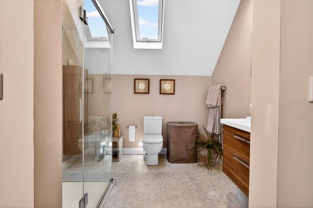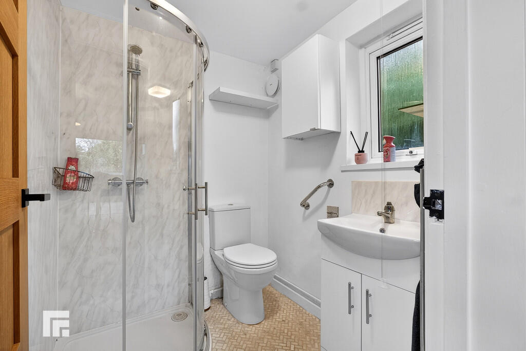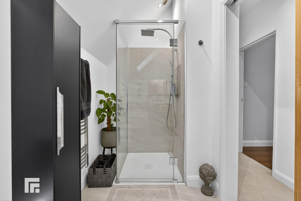 EN-SUITE8' 6" x 7' 0" (2.608m x 2.141m) Fully tiled shower cubicle with mains shower, glass screen and door. Wall hung wash hand basin set in vanity unit plus matching wall hung storage unit. Low level WC. Tiled flooring with electric underfloor heating. Velux window. Heated towel rail.