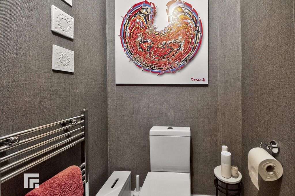 CLOAKROOM Modern wash hand basin set in vanity unit plus low level WC. Ceiling light point. Radiator. Continuation of tile flooring.