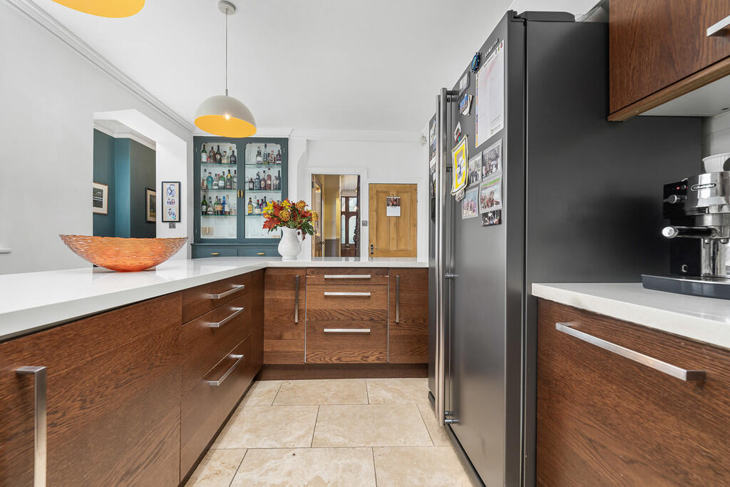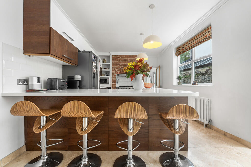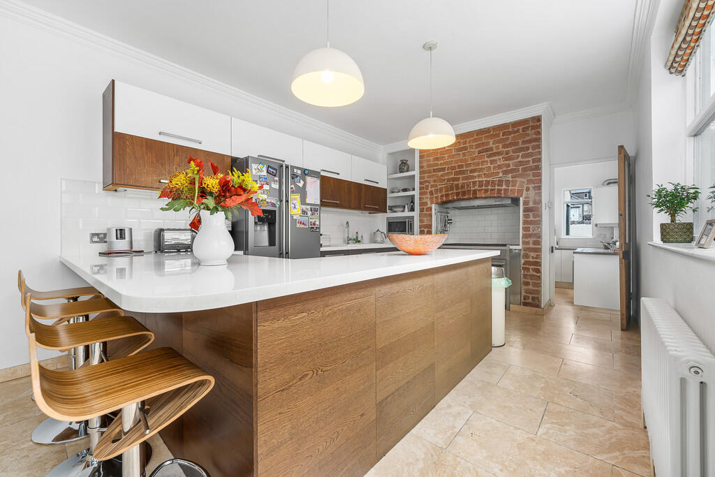 KITCHEN/DINER A lovely size kitchen/diner well designed and appointed with a large peninsula housing storage cupboards and drawers beneath. Space for American fridge freezer, integrated dish washer and integrated microwave built into one alcove with shelving above. Range gas cooker set in feature brick open fireplace with stainless steel extractor hood above, tiled splashbacks. White work surfaces incorporating ceramic sink and drainer with mixer tap and tiled splashbacks. Wine rack. Original floor to ceiling built in Dresser with glass display cabinets. Door leading to cellar area. Central heating radiator, power points. Large picture window to side aspect and half glazed door leading into;