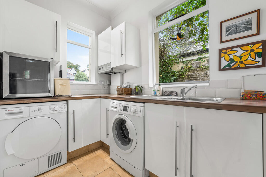 UTILITYROOM Windows to both side and rear aspects. Built in wall and base units with wood effect work surfaces incorporating stainless steel sink unit and drainer with mixer tap over. Wall mounted 'Worcester' boiler. Tall built in storage/cloaks cupboard to one wall. Power points. Continuation of ceramic tiled flooring. Half glazed door leading to rear garden. Door also giving access into;
