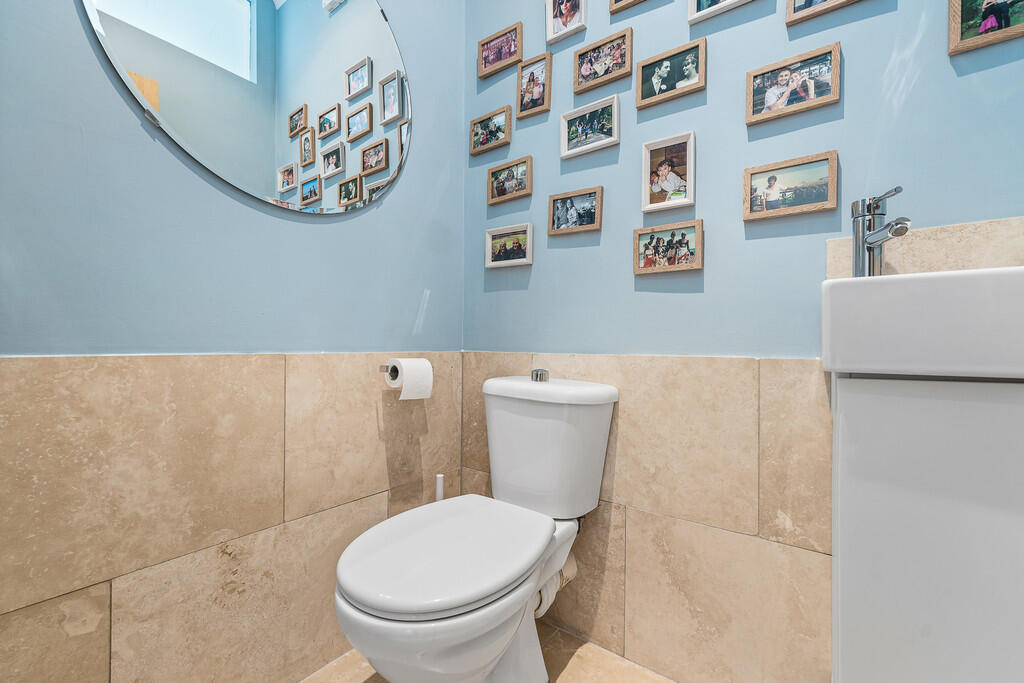 CLOAKROOM Continuation of ceramic tiled flooring from the kitchen and utility area and tiled splashback areas. Wash hand basin set in vanity unit and low level WC. Coving to ceiling. Heated towel rail.