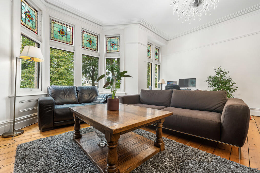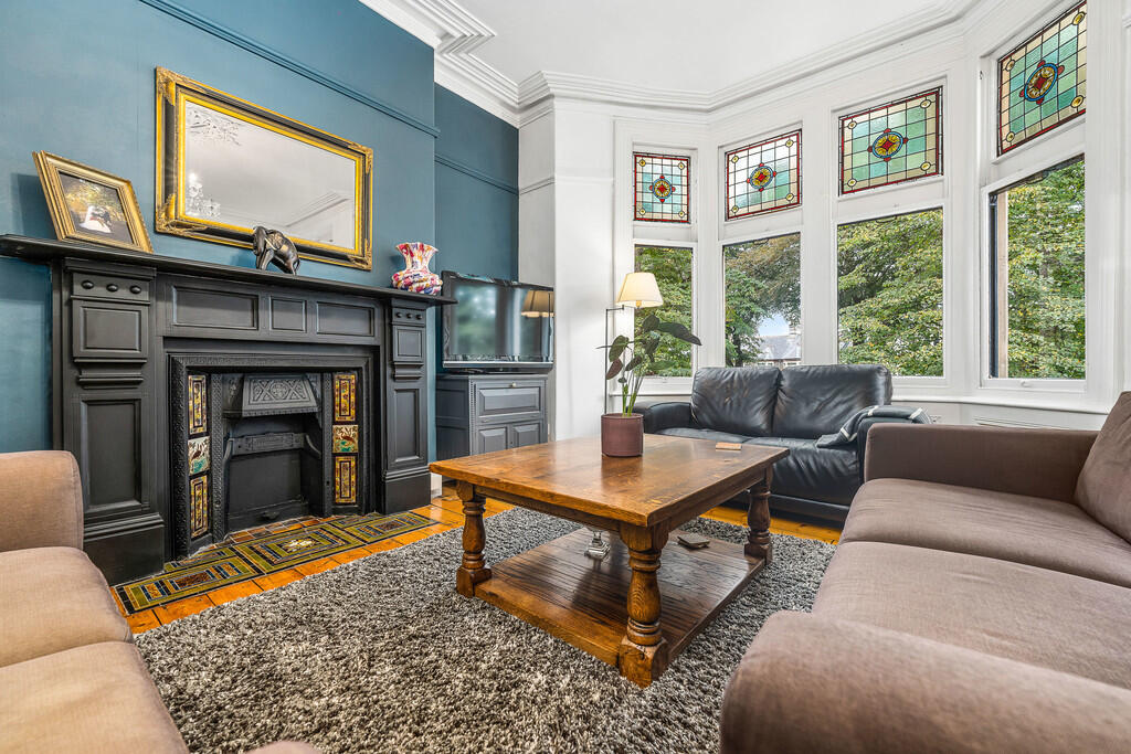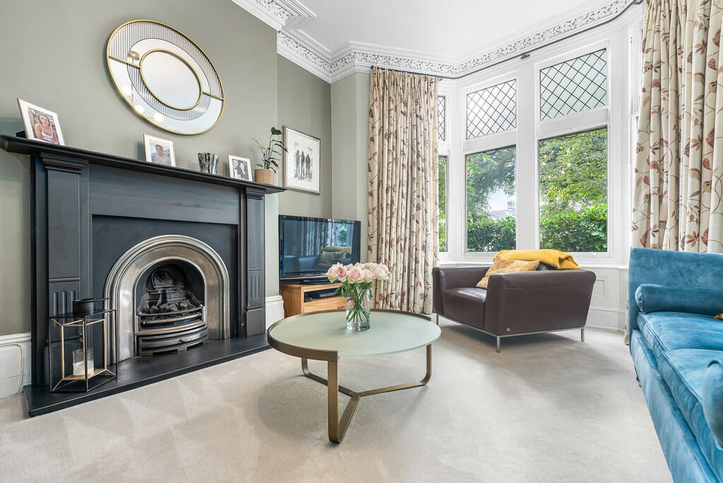 MASTERBEDROOM A superb size principal bedroom with high ceiling and bay window with sash windows and leaded lights to front aspect overlooking the Gardens. Original cast iron fireplace with decorative tiles to sides and hearth. Features to include deep skirting boards, coving, picture rail and central ceiling rose. Wooden flooring. TV point and power points. This room is currently being used as an additional lounge.