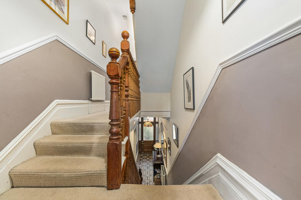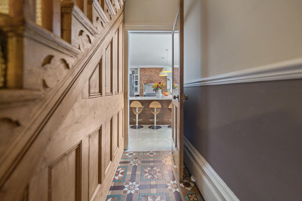 ENTRANCEHALL Entered via large oak wooden door, half glazed with feature patterned glass. Original tiled flooring in beautiful condition, deep skirting boards, ornate coving and ceiling rose. Dado rail, stairs with ornate wooden balustrades. Central heating radiator, power points. Oak wooden panelled doors throughout to all rooms.