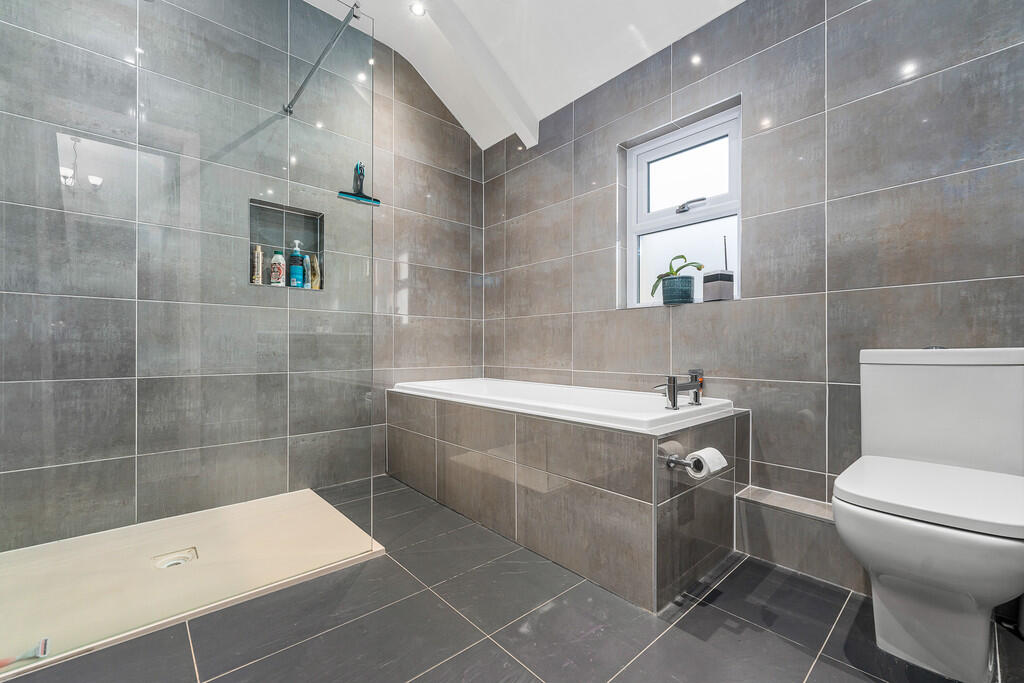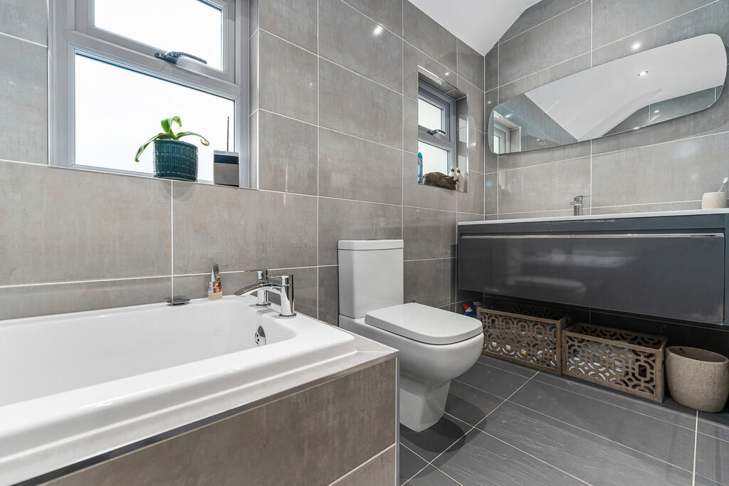 BATHROOM A modern bathroom with two obscure glazed windows to the side aspect. White suite comprising panelled bath, walk in shower with glass screen and mains rain shower, double wash hand basin set in floating vanity unit and low level WC. Fully tiled walls and flooring. Heated towel rail.
