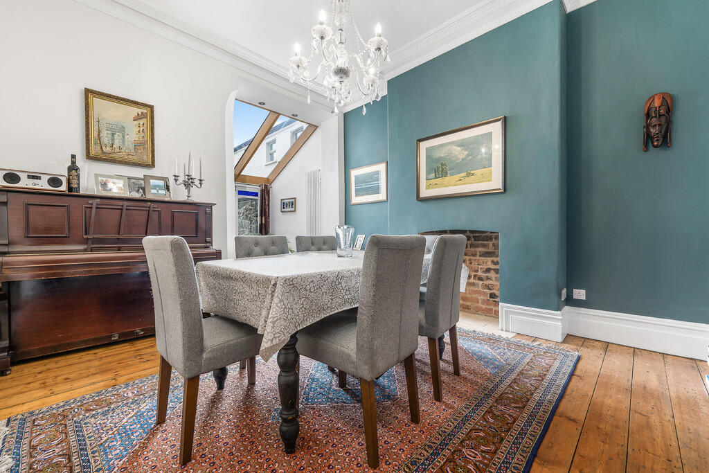 DININGROOM Again a well proportioned and light room with high ceiling, wooden flooring. Open feature fireplace. Deep skirting boards, ornate coving and ceiling rose. Open plan aspect into kitchen, glass roof and French doors giving access to rear garden.