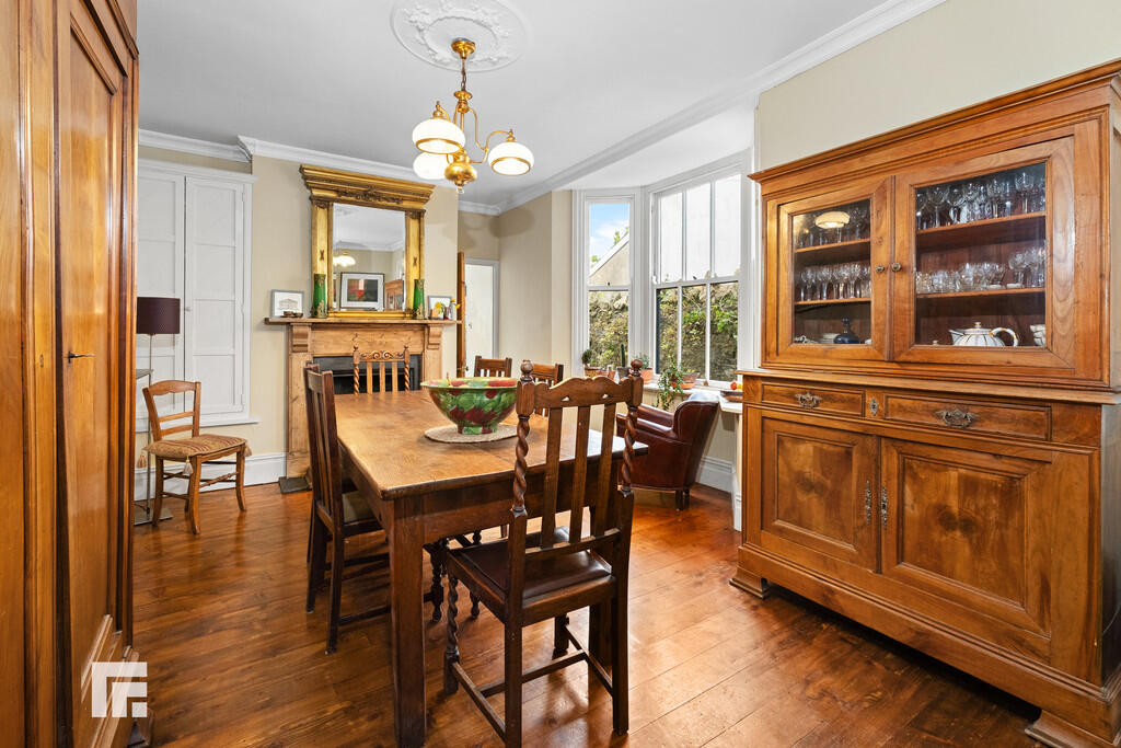 DININGROOM17' 4" x 12' 10" (5.29m x 3.92m) Wood flooring. Coving. Pendant light fitting with ceiling rose. Feature fireplace. Bay window and additional singular window to side aspect. Power points. Radiator. Alcove with built in storage. Door to basement and kitchen.