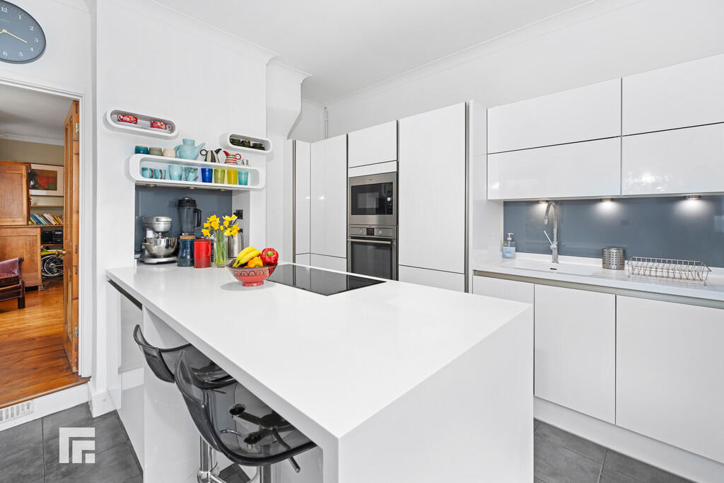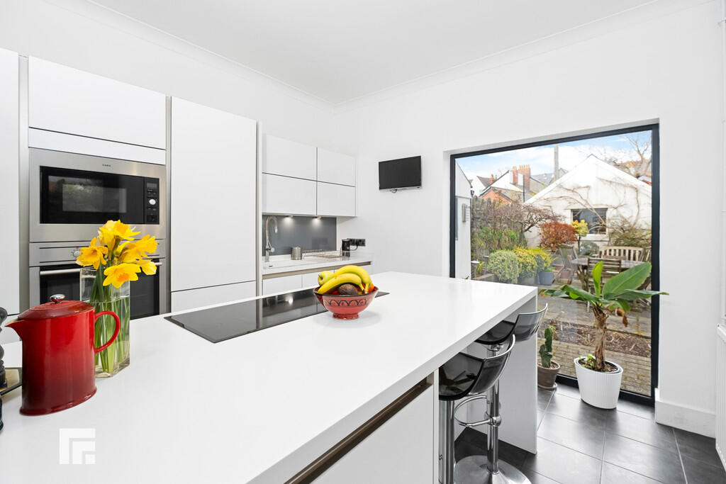 KITCHEN12' 10" x 10' 10" (3.92m x 3.32m) Tiled flooring. Modern fitted kitchen with a range of wall, base and drawer units with 'Corian' worktops over incorporating induction hob and inset sink and drainer with mixer tap over. Splashback. Integrated appliances such as fridge/freezer, dishwasher, microwave and oven. Spotlights. Power points. Central breakfast bar with storage beneath and stool seating. Double glazed aluminium feature window to rear aspect and door to garden. Radiator. Extractor fan. Double glazed uPVC door leading to rear garden.