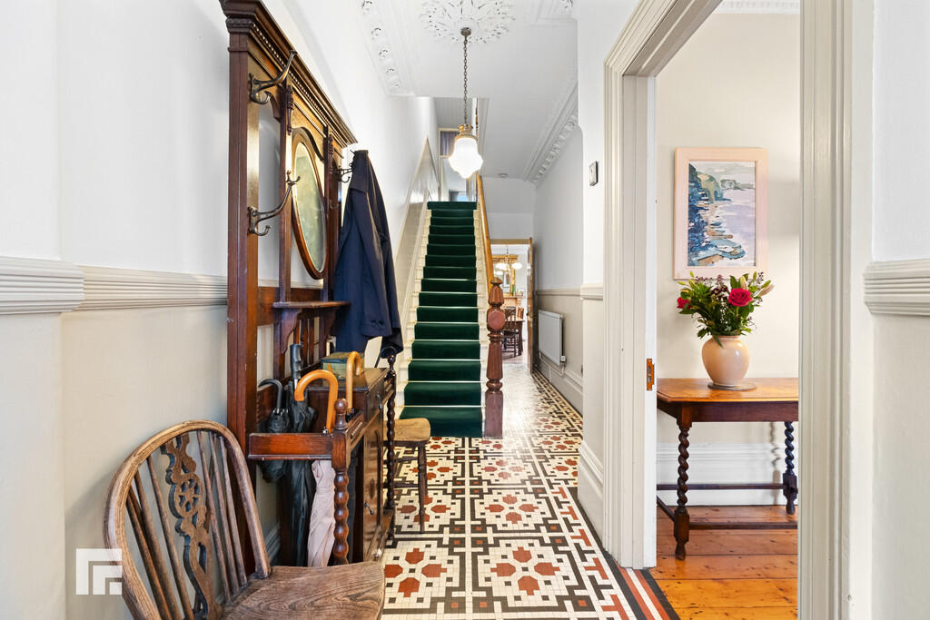 ENTRANCEHALL Entered via front door leading from front garden. Traditional tiled flooring. Original coving to ceiling. Pendant light fitting with ceiling rose. Dado rail. Radiator. Doors to lounge, sitting room and dining room. Stairs rising to first floor.