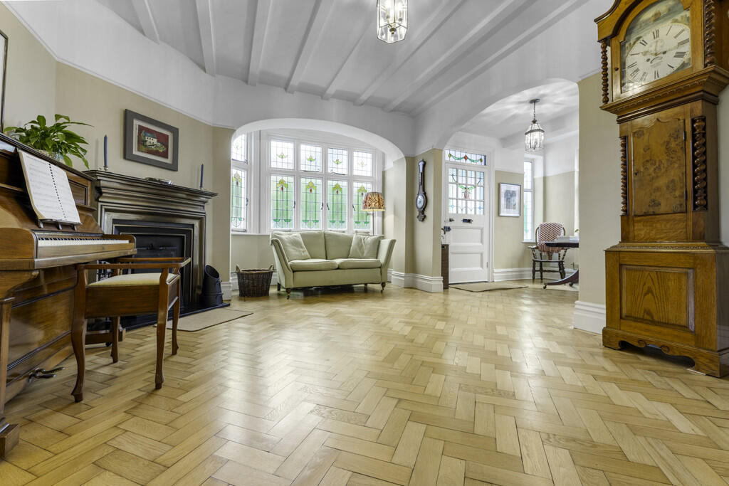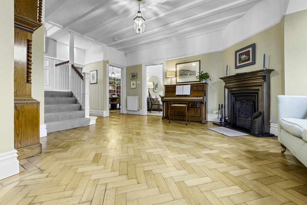 RECEPTIONHALLWAY23' 5" x 23' 3" (7.14m x 7.09m) Approached via the original wood panelled stained glass entrance door leading to the exceptionally spacious reception hallway with stained glass windows to two aspects. Feature open fireplace. Quality herringbone style woodblock flooring. Staircase to first floor.