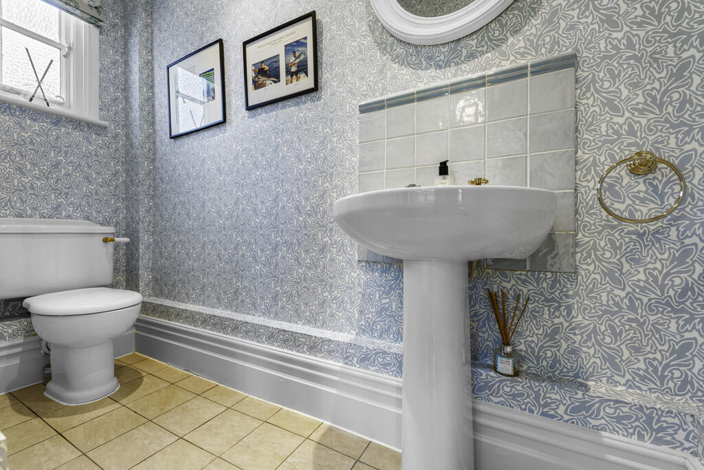 CLOAKROOM White suite comprising low level wc, wash hand basin. Tiled flooring. Tiled splash back. Obscured glass window. Radiator.