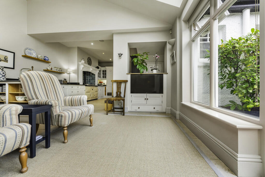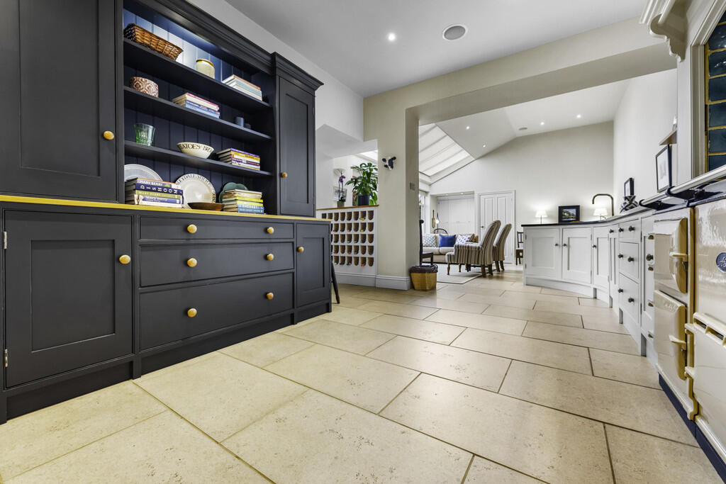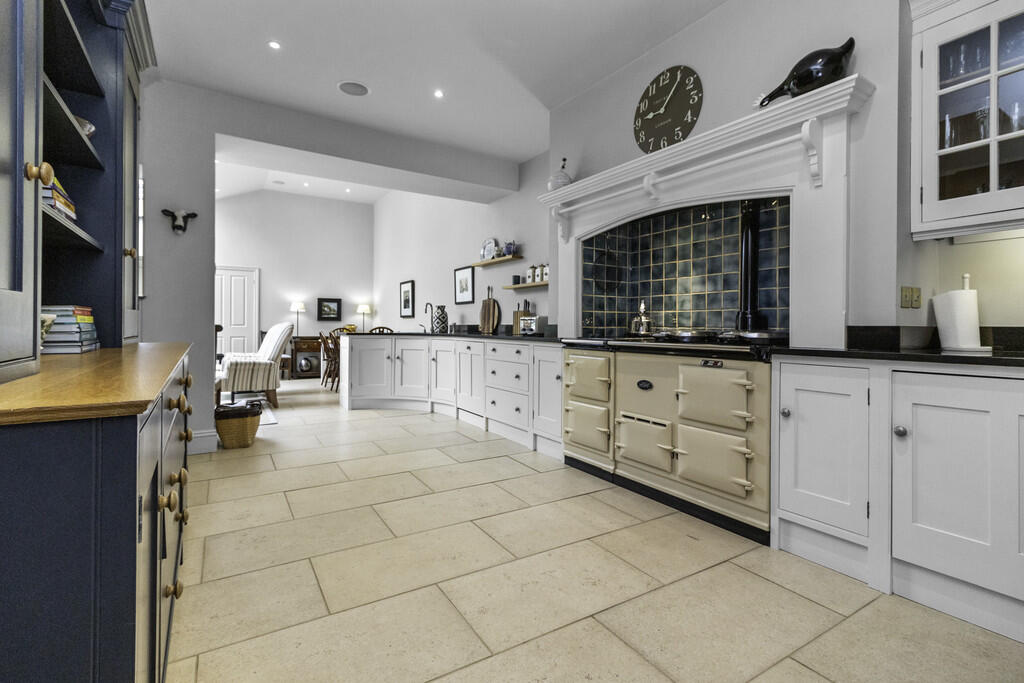 KITCHEN/DINER/FAMILYROOM33' 9" x 14' 11" (10.31m x 4.56m) A bespoke fitted kitchen appointed along three sides in wood panelled fronts beneath granite worktop surfaces. Inset ceramic sink. Inset chimney breast 'Aga' with tiled splashback. Integrated dishwasher and freezer. Ample space for family dining and seating with french doors and windows to front opening to the front paved patio. Windows and blinds to roof pitch. Recessed spotlights. Additonal built in storage. Tiled flooring throughout. Built in wine storage rack. Underfloor heating. Built in pantry housing the fridge freezer and with additional shelving and tiled flooring. Door to basement.