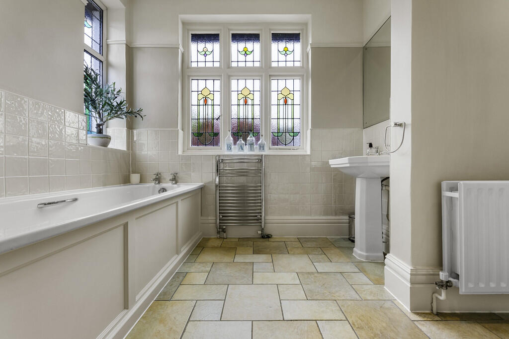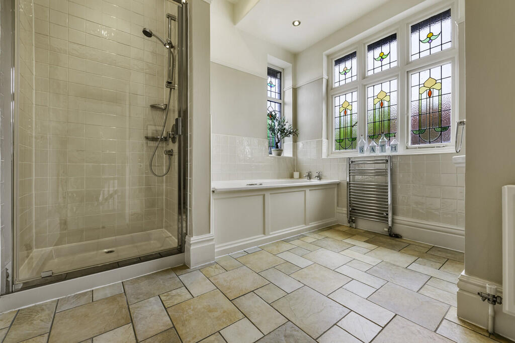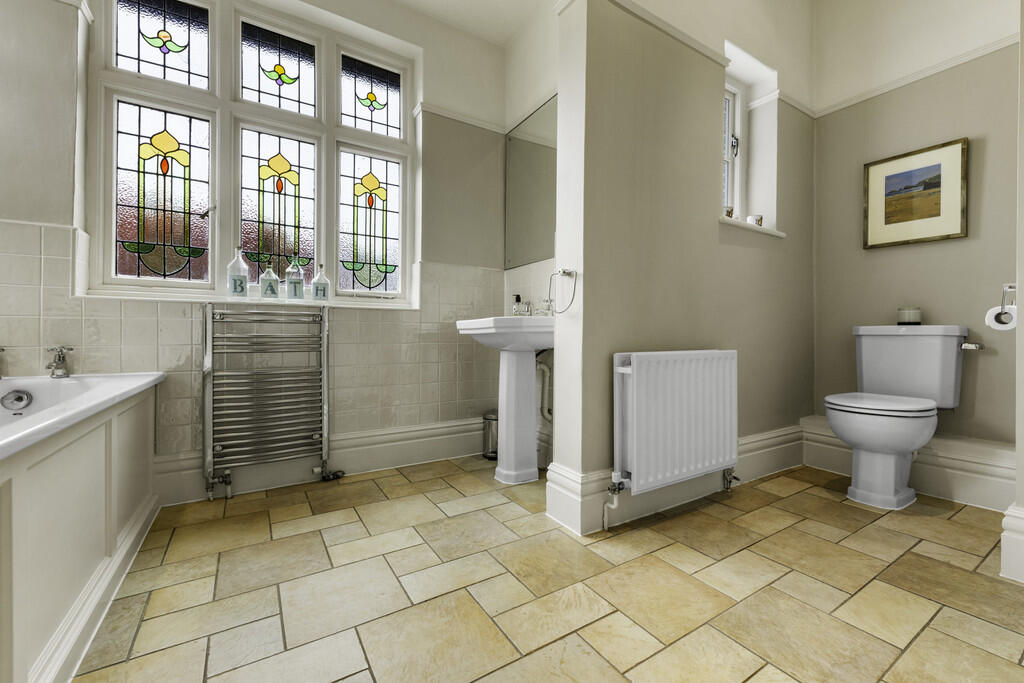 BATHROOM13' 1" x 9' 9" max to cupboards (3.99m x 2.98m) The suite comprises low level WC, pedestal wash hand basin, panelled bath, and fitted shower cubicle. Tiled flooring and splash backs. Feature stained glass windows to front. Ladder radiator. Spotlights. Extractor fan. Fitted storage cupboards to one wall.