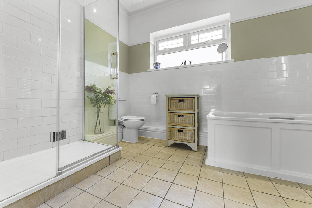 EN-SUITE11' 10" x 7' 6" (3.61m x 2.29m) Low level WC, pedestal wash hand basin, fitted double shower cubicle with glass screen, and panelled bath. Ladder radiator. Tiled flooring and splash backs. Spotlights. Extractor fan. uPVC double glazed window to front. LED mirror. Under floor heating.