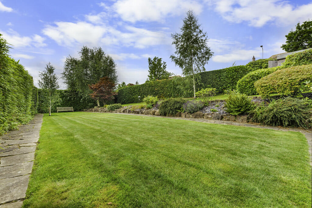 REARGARDEN A delightful south facing rear garden comprising large slate style paved patio leading onto a well manicured area of lawn enclosed by well tended hedgerow. An assortment of flower and shrub beds throughout with inset silver birch and Japanese Acers. A truly tranquil setting.