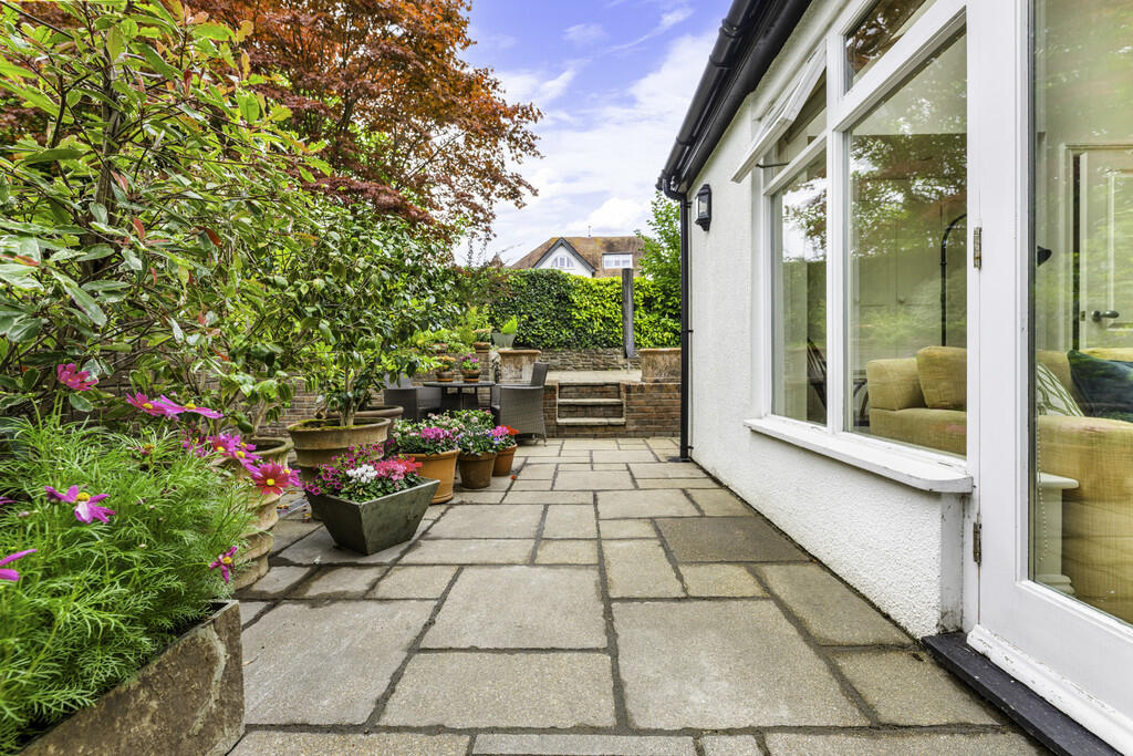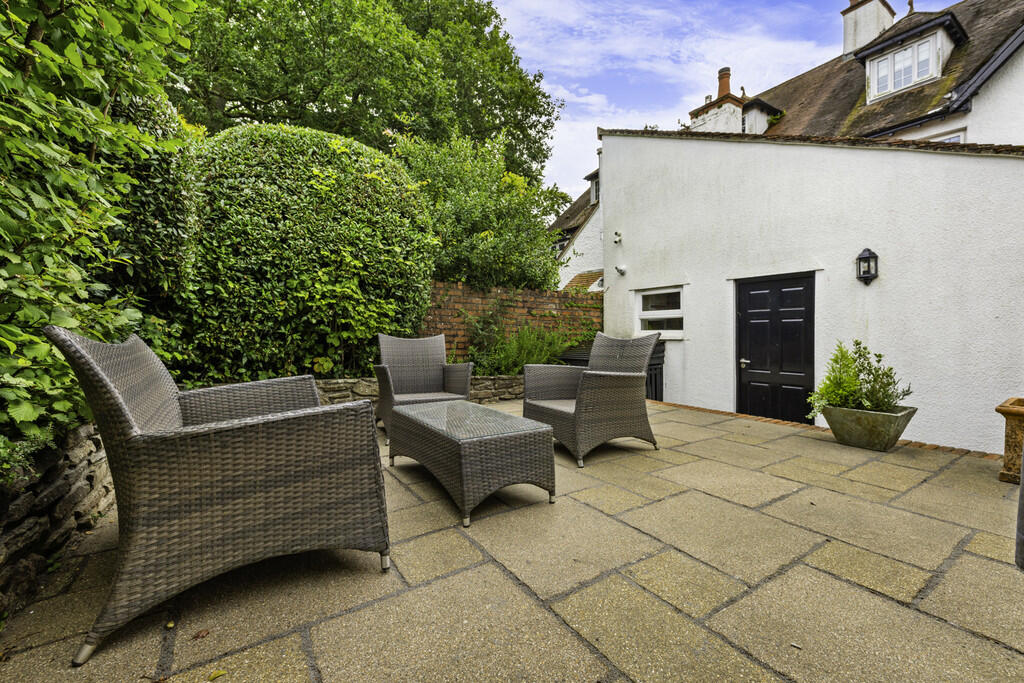 FRONTANDSIDEGARDEN Paved patio area to front with long driveway to side. Enclosed by hedgerow and low level brick wall. Inset plants and shrubs along with a maturing acer. Electric car charger. Access to the rear garden.