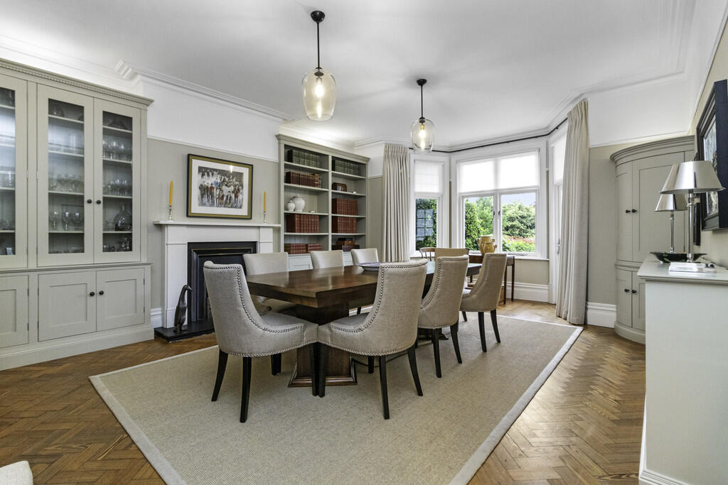 DININGROOM21' 4" x 15' 1" into bay (6.51m x 4.62m) Overlooking the large rear garden, with door to patio. Feature fireplace with fitted handmade cabinets either side of chimney breast. Quality woodblock flooring.