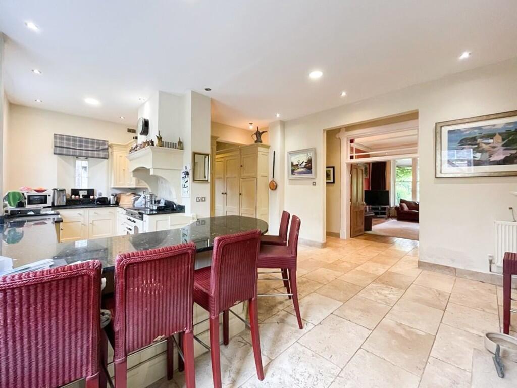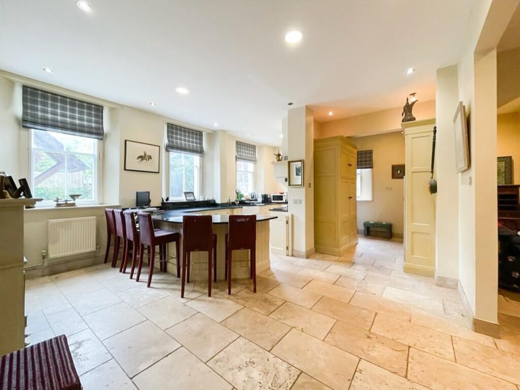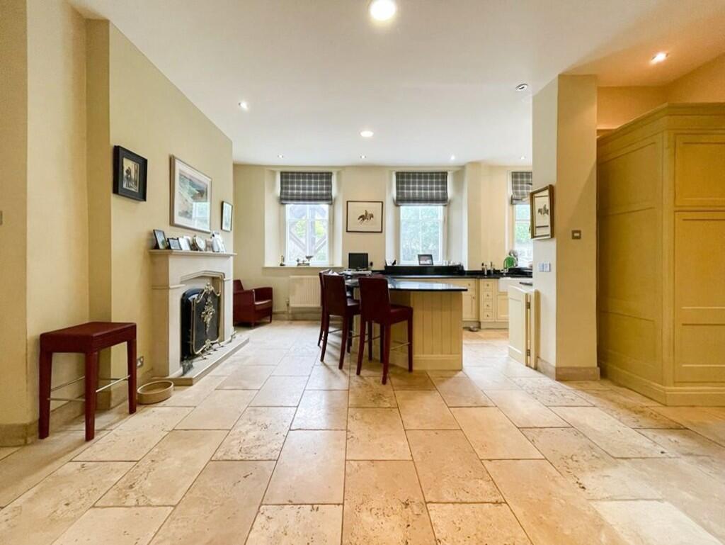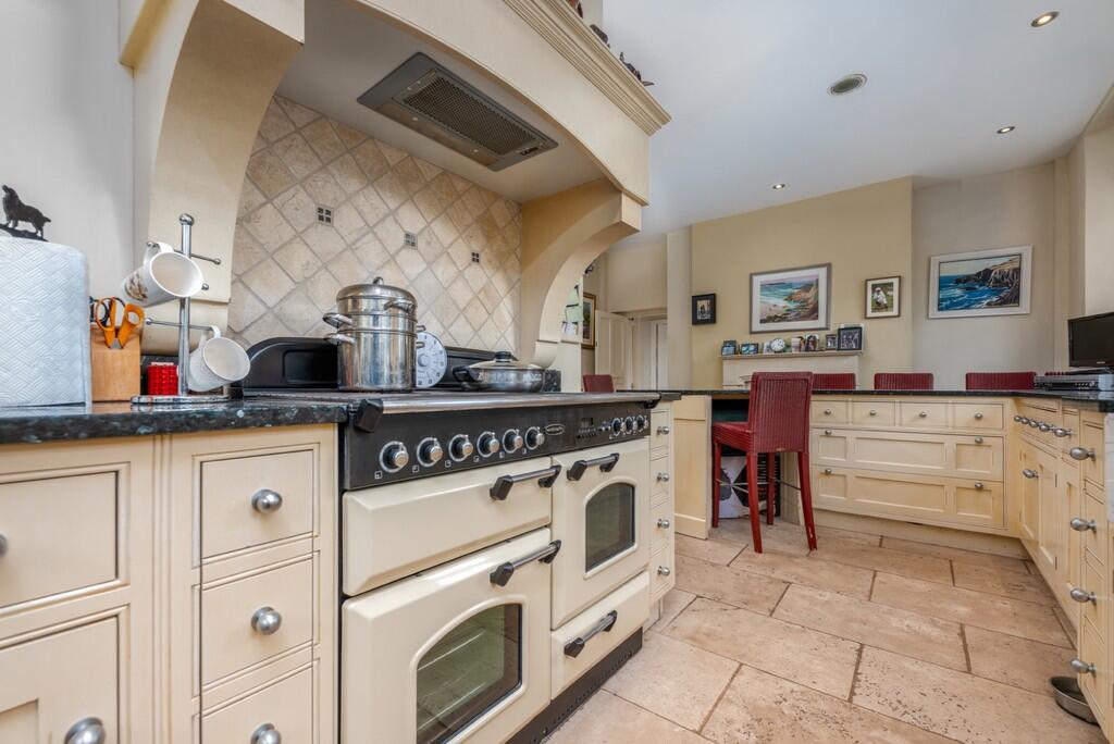 KITCHEN/BREAKFASTROOM24' 0" x 16' 8" (7.32m x 5.09m) A large kitchen breakfast room well appointed along three sides in panelled fronts beneath granite worktop surfaces, inset 2 bowl Belfast style sink, rangemaster cooker, concealed extractor hood above, matching eye level wall cupboards, worktop breakfast bar area, windows to front and side, marble & lime tiled flooring, additional larder style storage cupboards, feature sandstone fireplace, two radiators and door to side lobby.