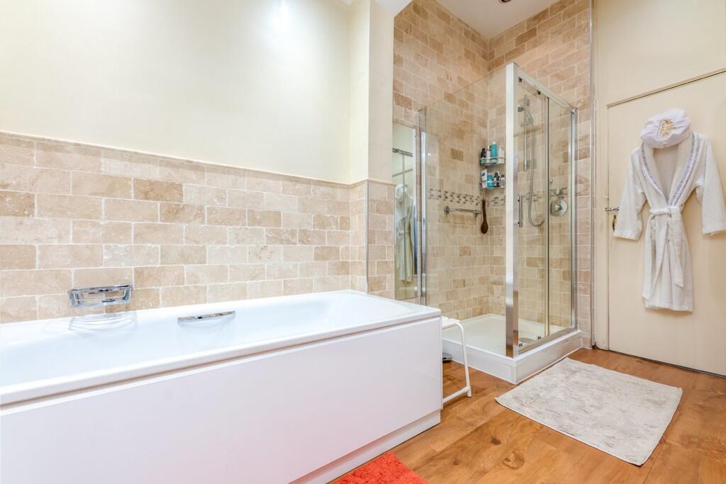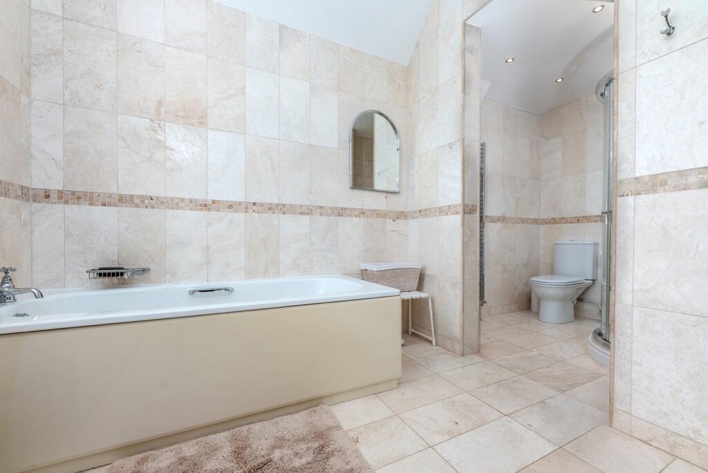 BATHROOM9' 3" x 7' 11" (2.820m x 2.435m) Original sash window to front. Fully tiled walls and floor. Panelled bath. Vanity unit with inset sink and cupboards and drawers below. Heated towel radiator. Shaver point. Spot lights. Opening to shower area.