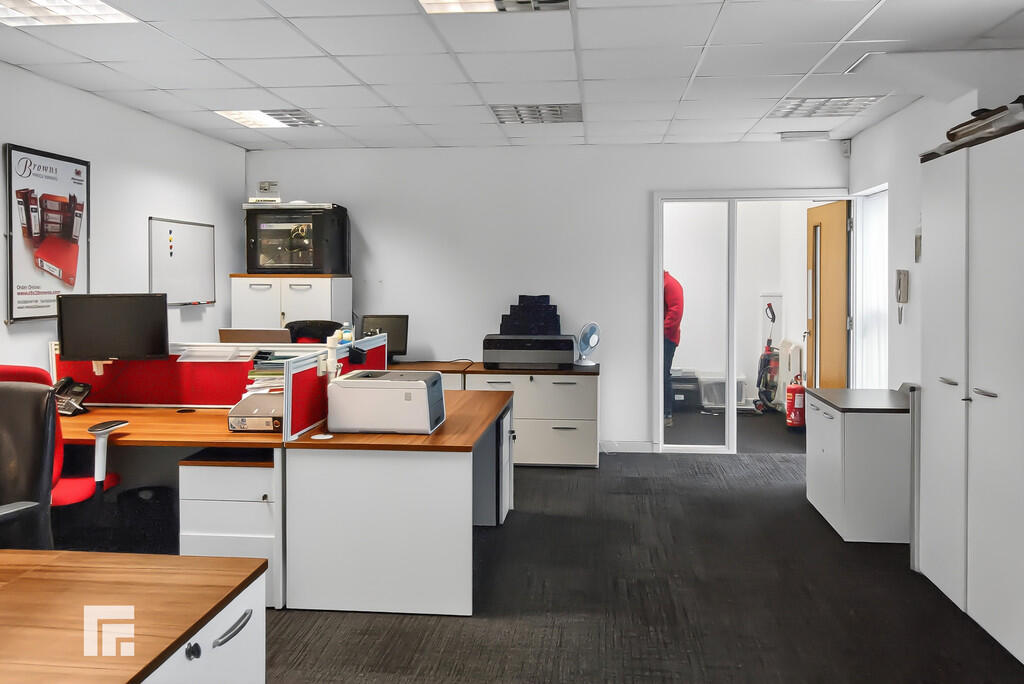 The property forms part of a 2 storey purpose built hybrid block, with the ground floor comprising office space and warehouse with roller shuttered access. There is also additional office space to the first floor. The office accommodation benefits from suspended ceilings, spot/category 5 lighting, ceramic tiled/concrete/carpet floors, electric heating, W.C facilities and a fully fitted kitchen. The unit benefits further from 4 allocated car parking spaces to front, Male and Female plus Disabled W.C facilities. There is also disabled ramp access.